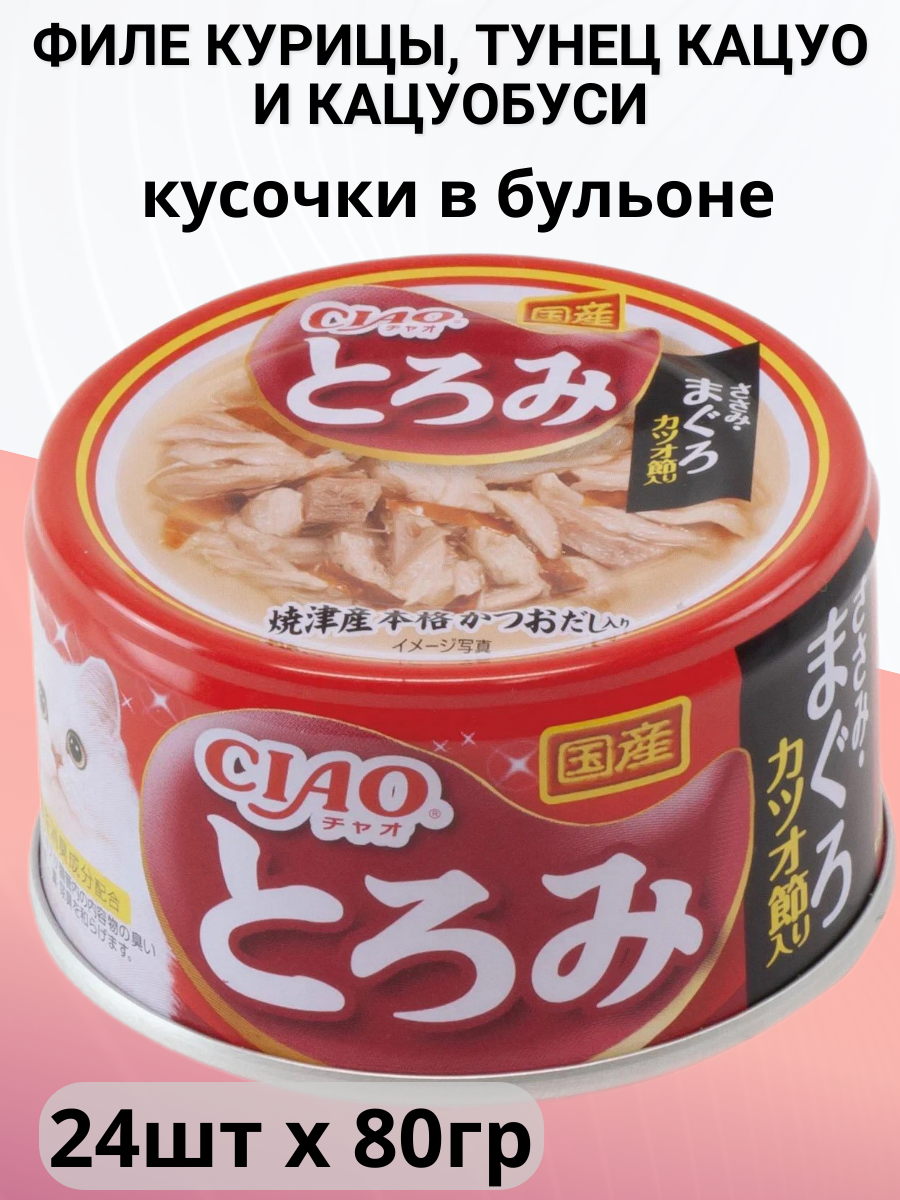 Купить Inaba Ciao Toromi влажный корм для кошек, куриное филе, тунец магуро и кацуобуси (24шт в уп) 80 гр с доставкой по всей России. Inaba Ciao Toromi влажный корм для кошек, куриное филе, тунец магуро и кацуобуси (24шт в уп) 80 гр: сравнение цен, характеристики, фото, актуальное наличие и цены.