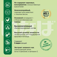 Состав: куриное филе, овощи (морковь, картофель, кабачок, зеленые бобы, зеленый горох), куриный жир, экстракт курицы, агар-агар, куриный порошок, гидролизованный белок, олигосахариды, лактобактерии, минеральные вещества (Ca, Fe, Cu, Mn, Zn, I), полисахариды, витамины (A, D3, E, B6, фолиевая кислота, B12, холин, биотин), экстракт зеленого чая, красный ферментированный рис