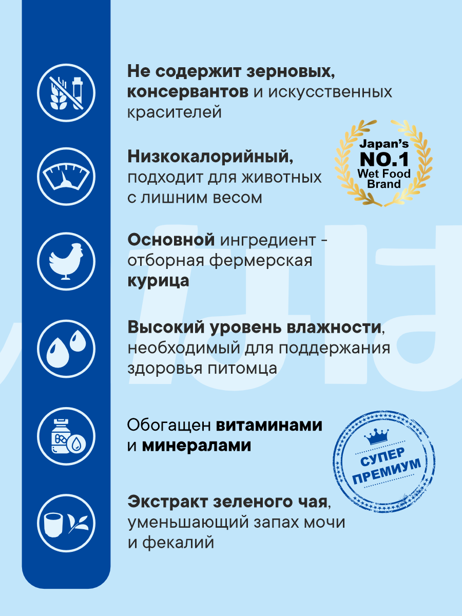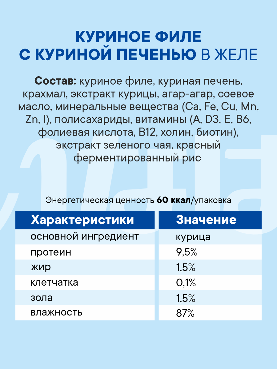- Суперпремиальный полнорационный влажный корм для собак Inaba Teishibo от японского производителя Inaba приготовлен на основе нежного куриного филе с куриной печенью. Корм имеет высокопитательный сбалансированный состав, отличается низким содержанием жира, а также обогащён витаминами и минералами. Корма и лакомства Inaba отличаются высоким качеством и неповторимым вкусом, ведь они изготавливаются на основе отборных традиционных японских ингредиентов! Во все продукты добавлен экстракт зеленого чая, который, благодаря содержанию катехина, обладает нейтрализующим действием на запах содержимого кишечника. В состав добавлен витамин Е - натуральный антиоксидант, поддерживающий иммунную систему. Корм не содержит искусственных добавок, красителей и консервантов. Состав: куриное филе, куриная печень, куриный жир, крахмал, экстракт курицы, агар-агар, соевое масло, минералы (Ca, Fe, Cu, Mn, Zn, I, K, Mg, Se), загуститель, витамины (A, D3, E, B1, B2, B6, B9, B12, холин, B7), экстракт зеленого чая, красный ферментированный рис. Аналитический состав: белок – не менее 8,5%, жиры – не менее 1,5%, клетчатка – не более 0,1%, зола – не более 1,5%, влажность – не более 88% рекомендации ПО кормлению: Для собак весом 3 кг: 4 упаковки в день; для собак весом 5 кг: 5 упа-ковок в день; для собак весом 10 кг: 9 упаковок в день. Вскрытую упаковку хранить в холодильнике не более 24 часов.