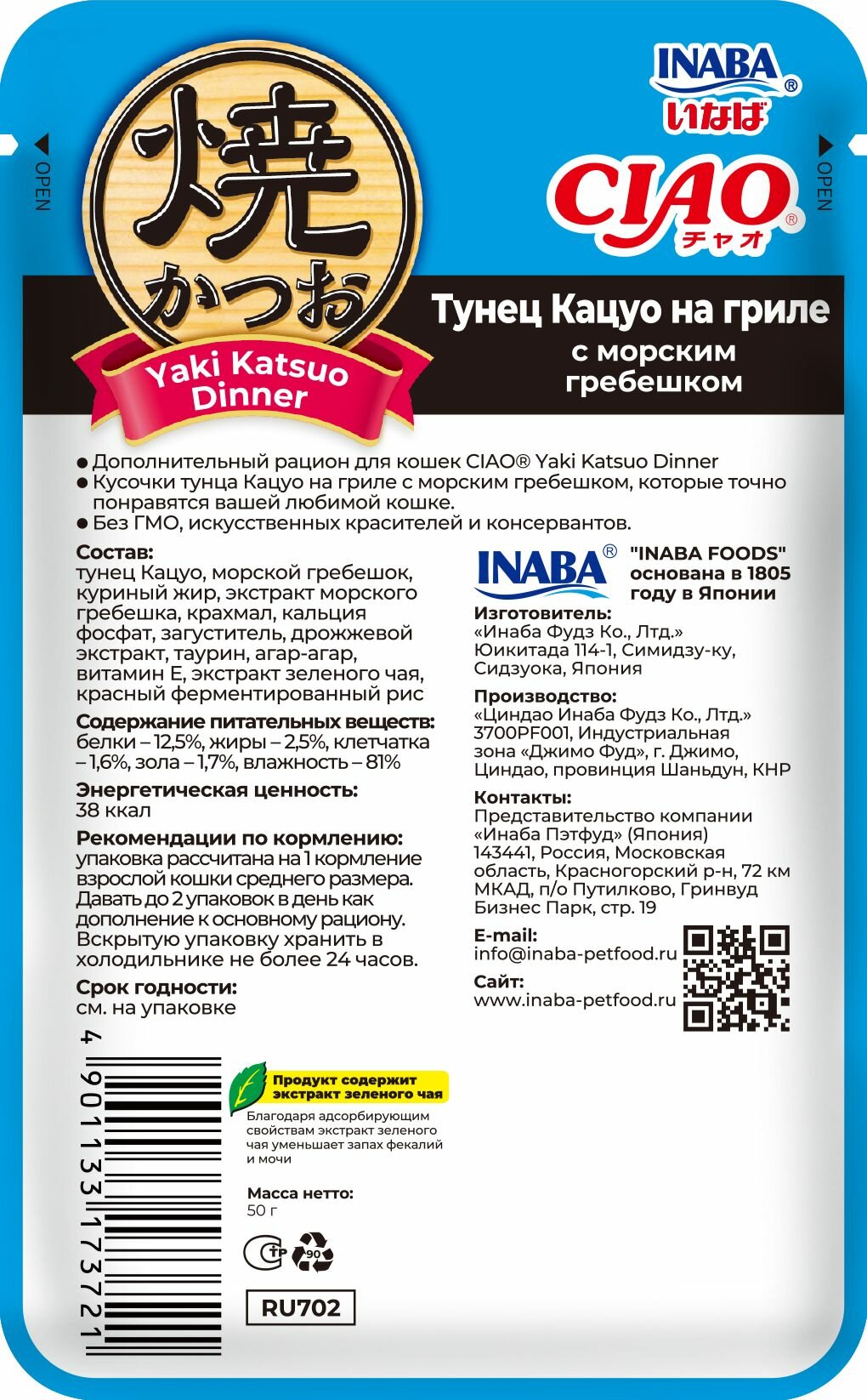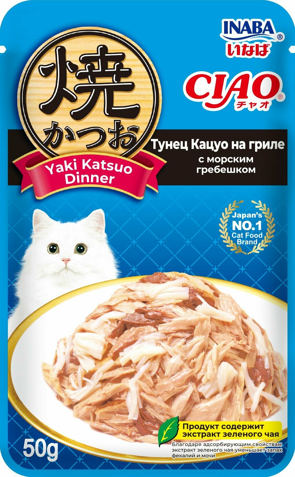 INABA Влажный корм д/кошек Yaki Katsuo Dinner Тунец Кацуо на гриле с морским гребешком пауч 50г*16шт(800гр.): сравнение цен, характеристики, фото, актуальное наличие и цены.