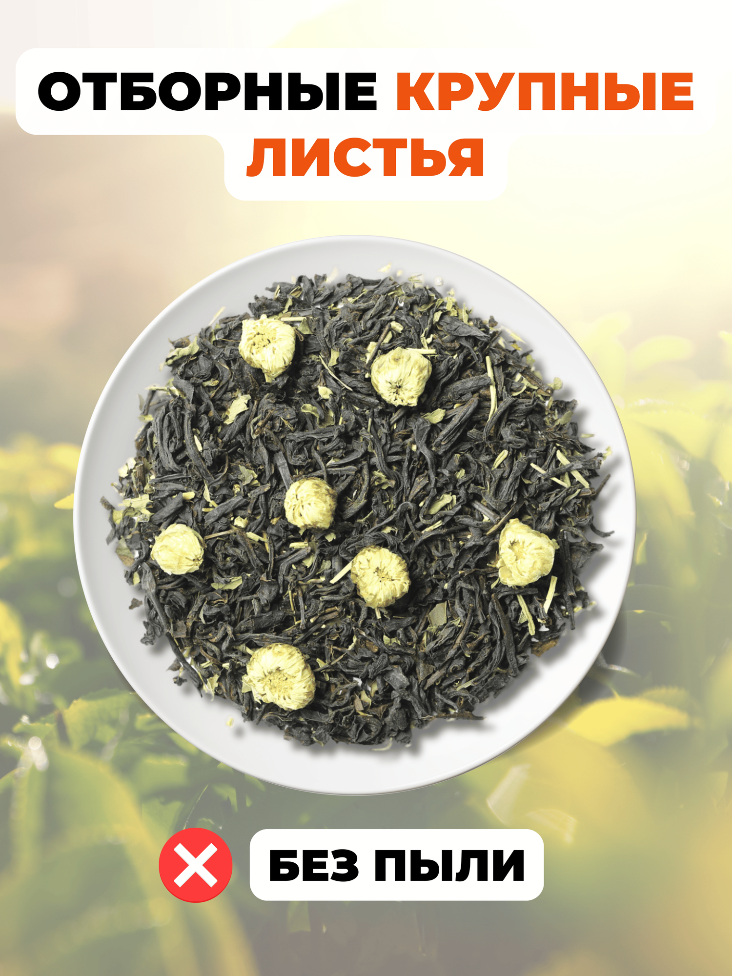 В купаже индийского черного чая с чабрецом и мятой добавлена китайская ромашка целыми соцветиями. Они придают настою красивый золотисто-янтарный цвет, вносит летние нотки во вкус. При заваривании соцветия раскрываются и очень красиво выглядят в прозрачном чайнике — отличный вариант для приема гостей.
