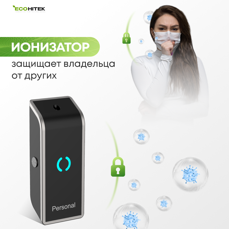 Персональный очиститель воздуха Personal NEW с инновационной технологией ионизации обеспечивает защиту от вирусов, бактерий, пыли и аллергенов.