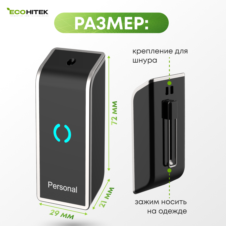 Компактный мини прибор обеззараживатель бренда EcoHiTek удобно одевается на шею и очищает воздух вокруг вас. Маленький ионизатор очиститель вырабатывает непрерывный поток отрицательных ионов, который способствует удалению из окружающей среды взвешенных частиц пыли, содержащих аллергены, бактерии. Создаваемый бактерицидный ионный щит реализует постоянную фильтрацию воздуха в вашем личном пространстве, что особенно актуально в сезон простуд.