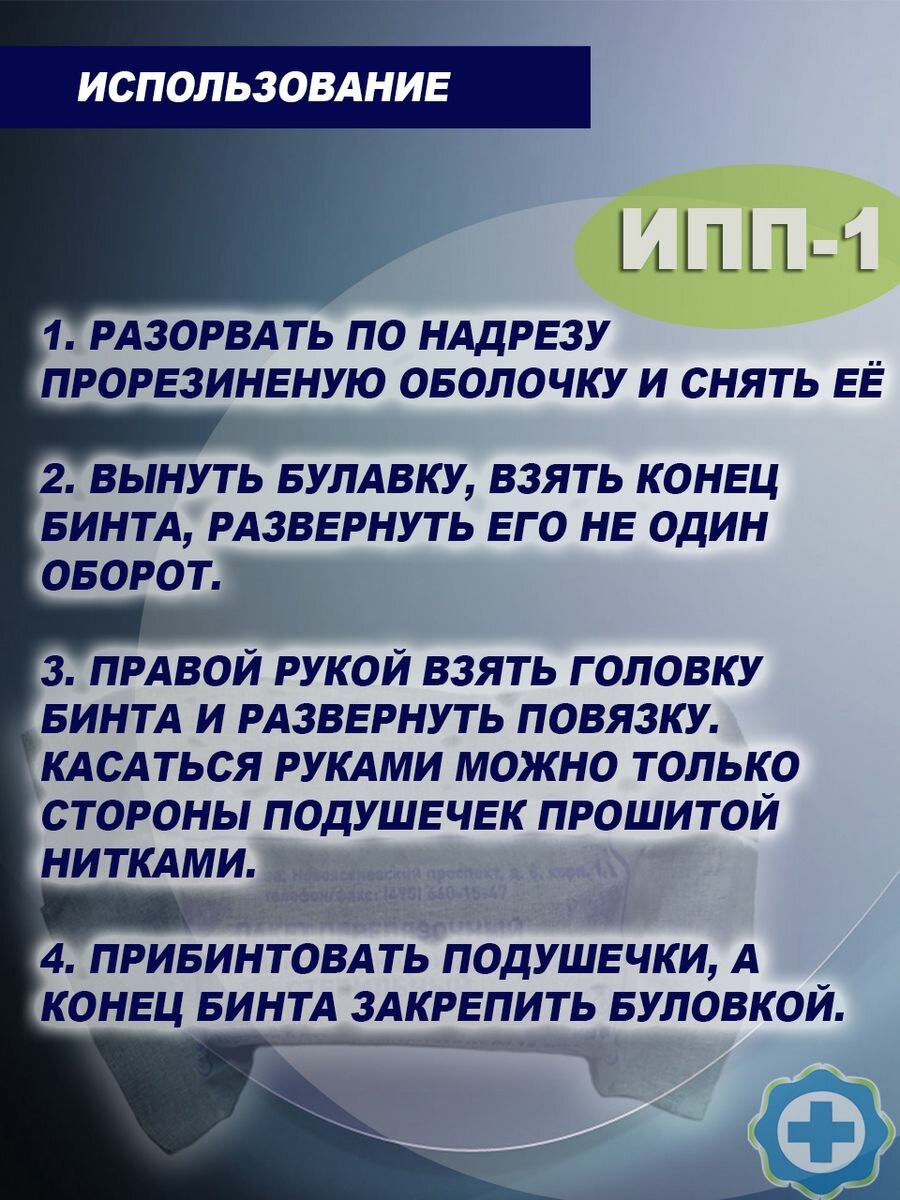 Пакеты перевязочные индивидуальные предназначены для оказания первой медицинской само- и взаимопомощи посредством наложения первичных повязок на раны при несчастных случаях, стихийных бедствиях, техногенных авариях и других экстремальных ситуациях, в том числе в военных условиях. Индивидуальный перевязочный пакет ИПП-1 - для оказания первой помощи при ранениях и ожогах. Комплект медицинский ИПП-1 предназначен для оказания первой медицинской само- и взаимопомощи при несчастных случаях, стихийных бедствиях, техногенных авариях и других экстремальных ситуациях, в том числе в военных условиях. Состав: пакета: Повязка-подушечка из нетканого полотна подвижная; Повязка-подушечка из нетканого полотна неподвижная; Размеры подушечки не более 17.5×32 см. Марлевый бинт; Размеры бинта не более 10 см x 7.0 м. Безопасная булавка; Двухслойная герметичная упаковка — внутренняя упаковка из пергамента и внешняя прорезиненная ткань. Перевязочный пакет изготавливается по ГОСТ 1179-93. Упакован в герметическую наружную оболочку из прорезиненной ткани. Срок годности: 5 лет.