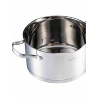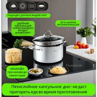 Кастрюля со сливом HOFFMANN выполнена из высококачественной нержавеющей стали, которая обеспечивает долгий срок службы изделия с сохранением первоначальных полезных свойств, а также делает посуду практичной и легкой в использовании. Имеет энергосберегающее капсульное дно (новейшая технология), эргономичные удобные ручки из нержавеющей стали. Термостойкая стеклянная крышка оснащена сливом, для более удобного использования кастрюли при приготовлении ваших блюд. Также для удобства внутри кастрюли имеется шкала литража, что способствует более точным пропорциям при готовке.
