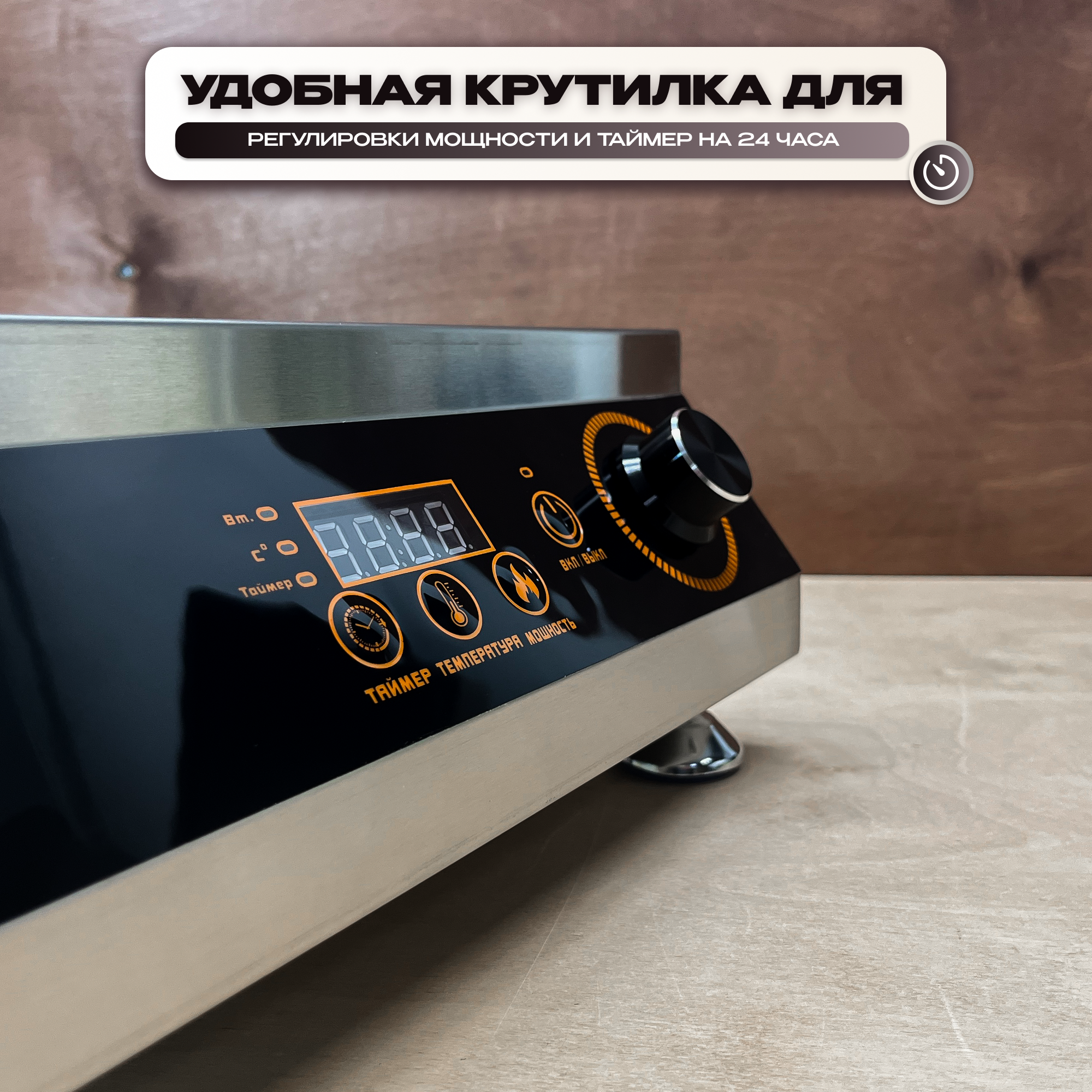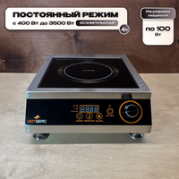 Плита работает в постоянном (без импульсном) режиме нагрева при любой мощности, без рывков. Без импульсный (постоянный) нагрев от 400 Вт до 3500 Вт (3.5 кВт). Плавный шаг переключения мощности в 100 Вт.