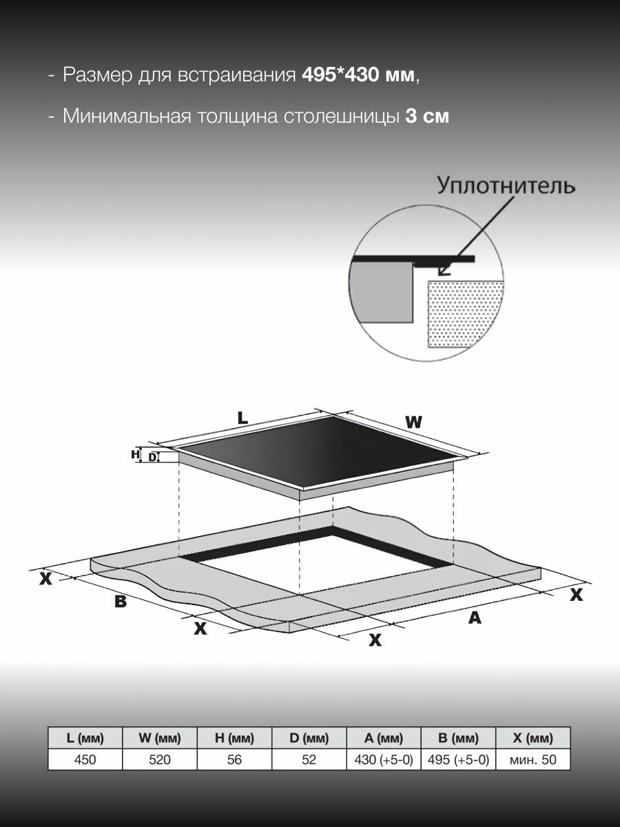 | безопасность | защитное отключение конфорок, индикатор остаточного тепла, кнопка блокировки панели |