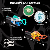 2 пусковых установки Эпик Лончер Стартер, 2 металлических волчка, 2 монтажных инструмента, сборная арена, инструкция