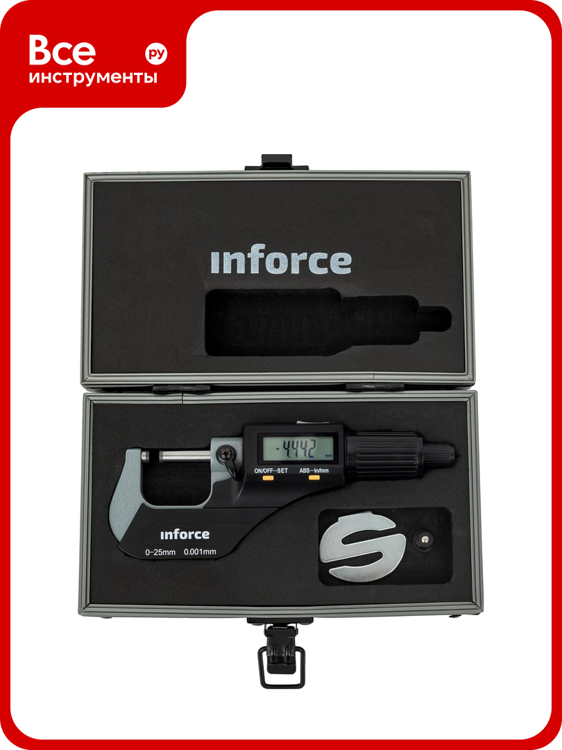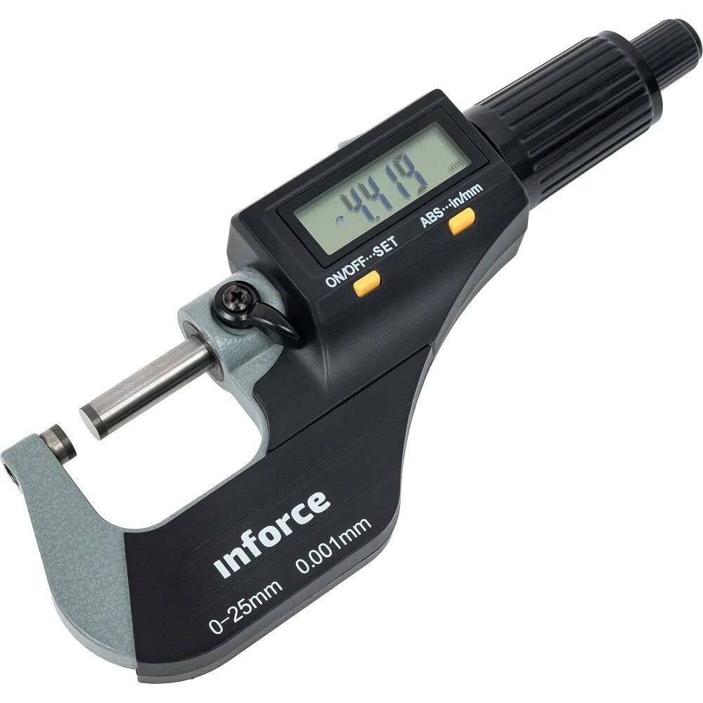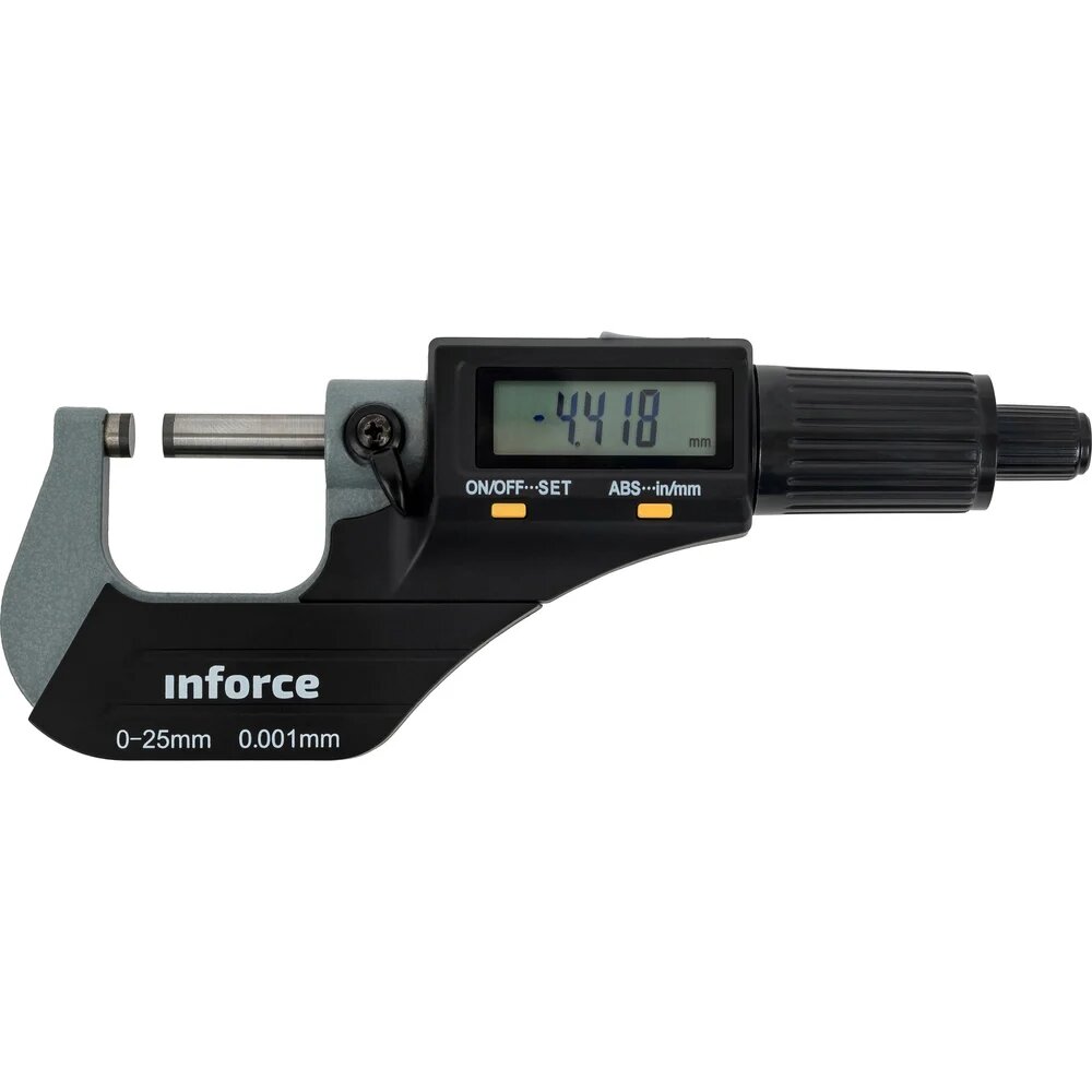 Цифровой микрометр 0-25мм/0-1"*0.001мм/0.00005" Inforce 06-11-44 - простой и удобный измерительный прибор, который с высокой точностью определяет линейный размер детали. Отклонения в пределах заявленной нормы – 0,003 мм. Цена деления - 0,001мм
