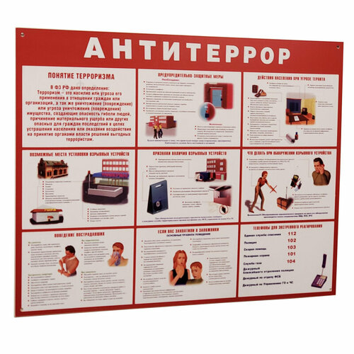 Информационный стенд "Антитеррор красный" содержит практические инструкции реагирования в случае террористического акта. Подходит для размещения в местах большого скопления людей, таких как: торговые центры, кинотеатры, образовательные учреждения, производственные комплексы и т. д. Монтаж стенда предназначен для размещения на стене. Для монтажа стенд комплектуется четырьмя декоративными шурупами с дюбелями. Размер: 910х700 мм.