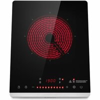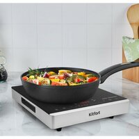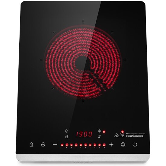 Инфракрасная плита KT-146 выполнена в пластиковом корпусе с рабочей поверхностью из стеклокерамики и обладает мощностью до 2000 Вт! В отличие от индукционных плит, инфракрасная плита не имеет импульсного режима. Нагрев происходит постоянно даже на самых минимальных мощностях. С помощью сенсорного слайдера установите нужный нагрев до 2000 Вт, температуру до 500°C и таймер до 24 часов. Функция блокировки кнопок сохранит заданные вами настройки, а индикатор «Горячо» предупредит вас, когда поверхность плиты сильно нагрета. Для инфракрасной плиты Kitfort KT-146 подходит практическая любая посуда, однако рекомендуется использовать посуду с плоским дном. Плита выдерживает вес не более 10 кг.