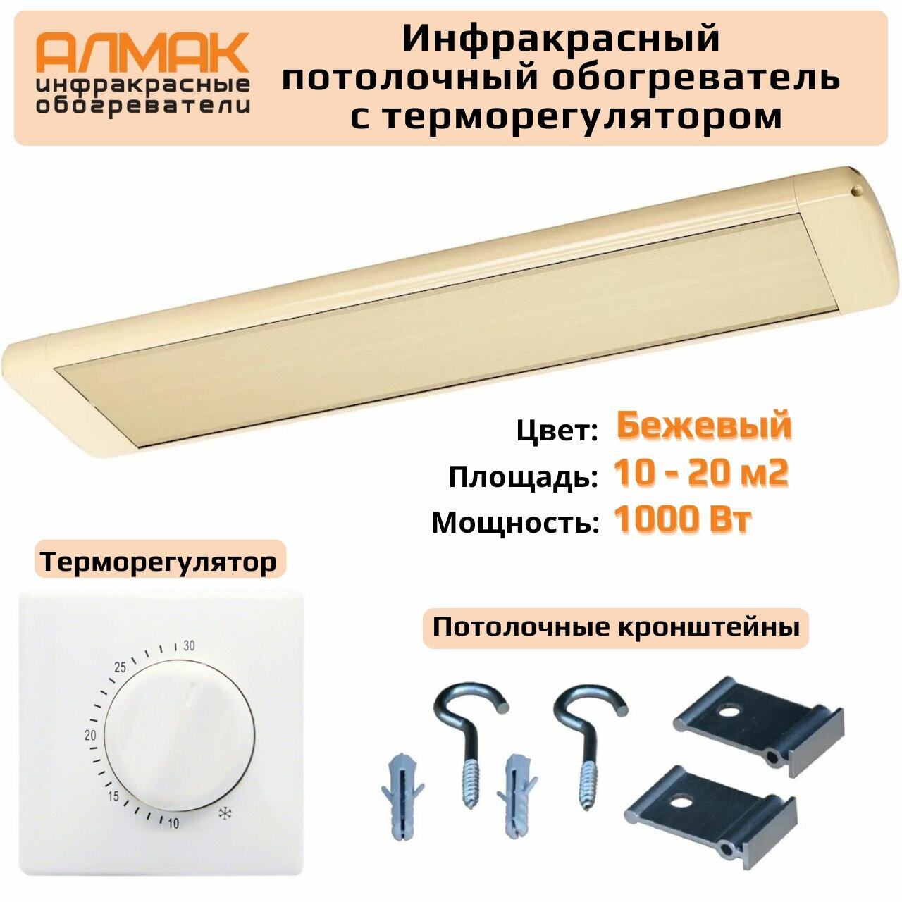 Купить Инфракрасный обогреватель потолочный с терморегулятором Алмак ИК-11 Бежевый 1000 Вт с доставкой по всей России.