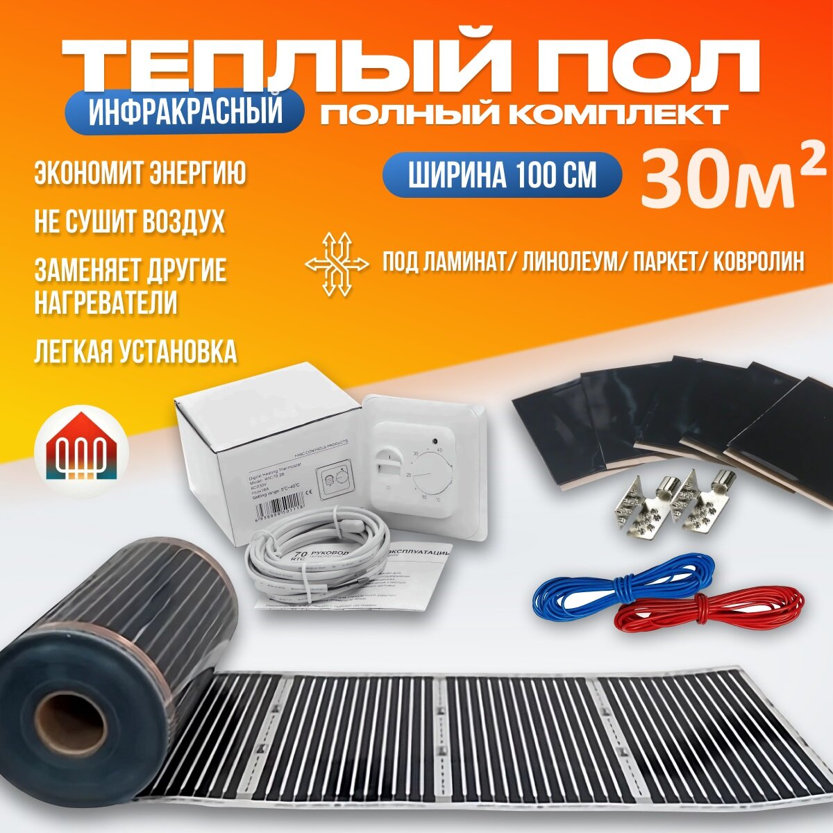 Купить Инфракрасный пленочный теплый пол 100см 30м. п. 220 Вт/м. кв. с механическим регулятором, под ламинат, линолеум, ковролин с доставкой по всей России.