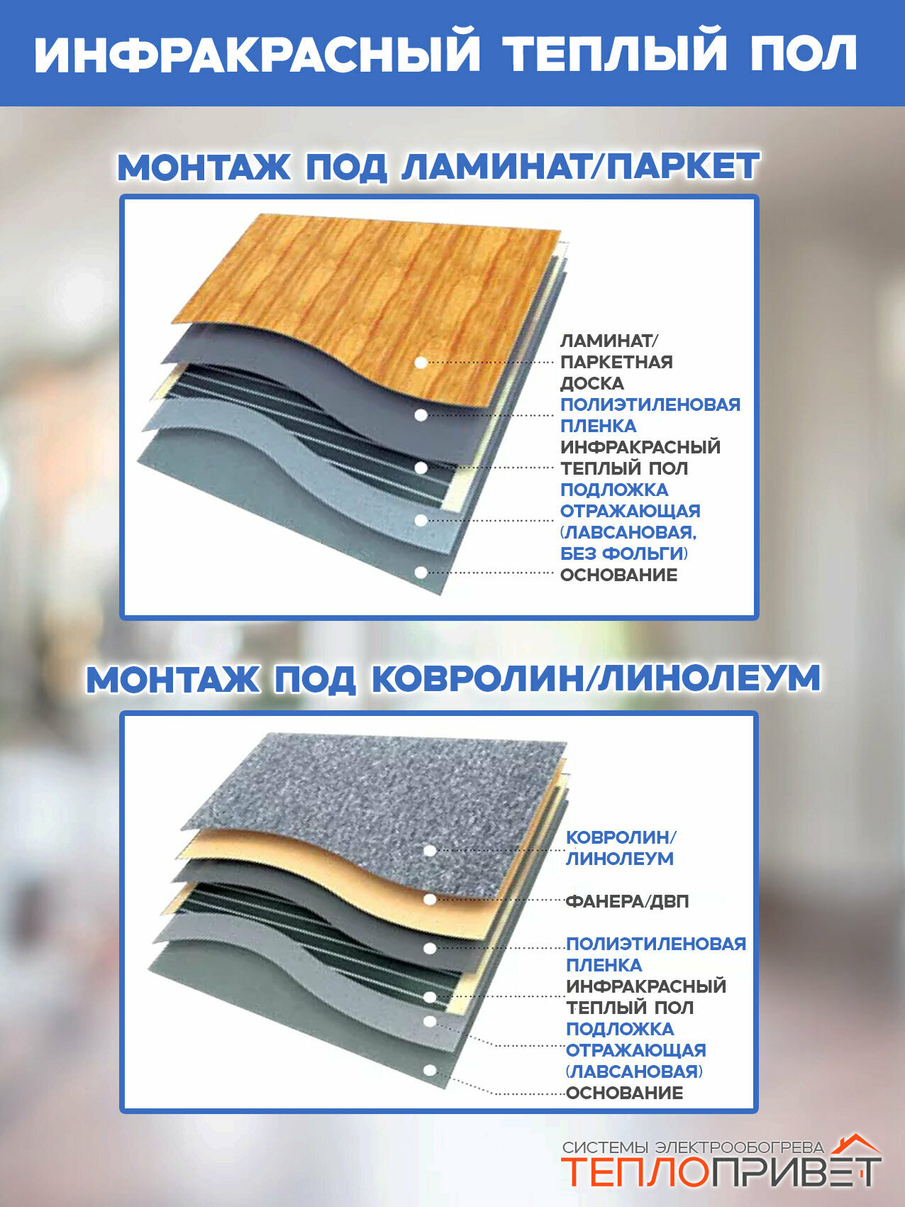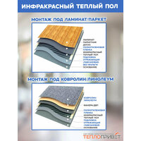 Ультратонкая инфракрасная пленка укладывается под любые напольные покрытия: ламинат, паркет, линолеум и ковролин методом сухого монтажа без стяжки.