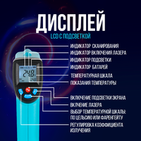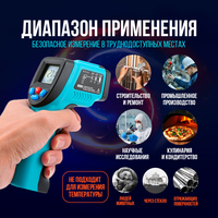 RichMeters GM550 Blue - портативный цифровой бесконтактный инфракрасный термометр пирометр (рихметр, тепловизор) с лазерным указателем, функцией измерения влажности, сигнализацией высокой и низкой температуры, полноэкранным цветным экраном. Позволяет измерять на расстоянии температуру различных тел, предметов и жидкостей в диапазоне -50°C ~ 550°C. Высокая функциональность, малый вес и размеры и длительный срок работы от двух элементов питания размера ААА - делают этот прибор незаменимым в профессиональном использовании и в быту. Вы можете измерить температуру продуктов при приготовлении, найти источники тепла (холода) в стенах - в виде спрятанных там труб отопления, греющихся проводов, отсутствии или нарушении утепления - спектр применения бесконтактного термометра достаточно широк.