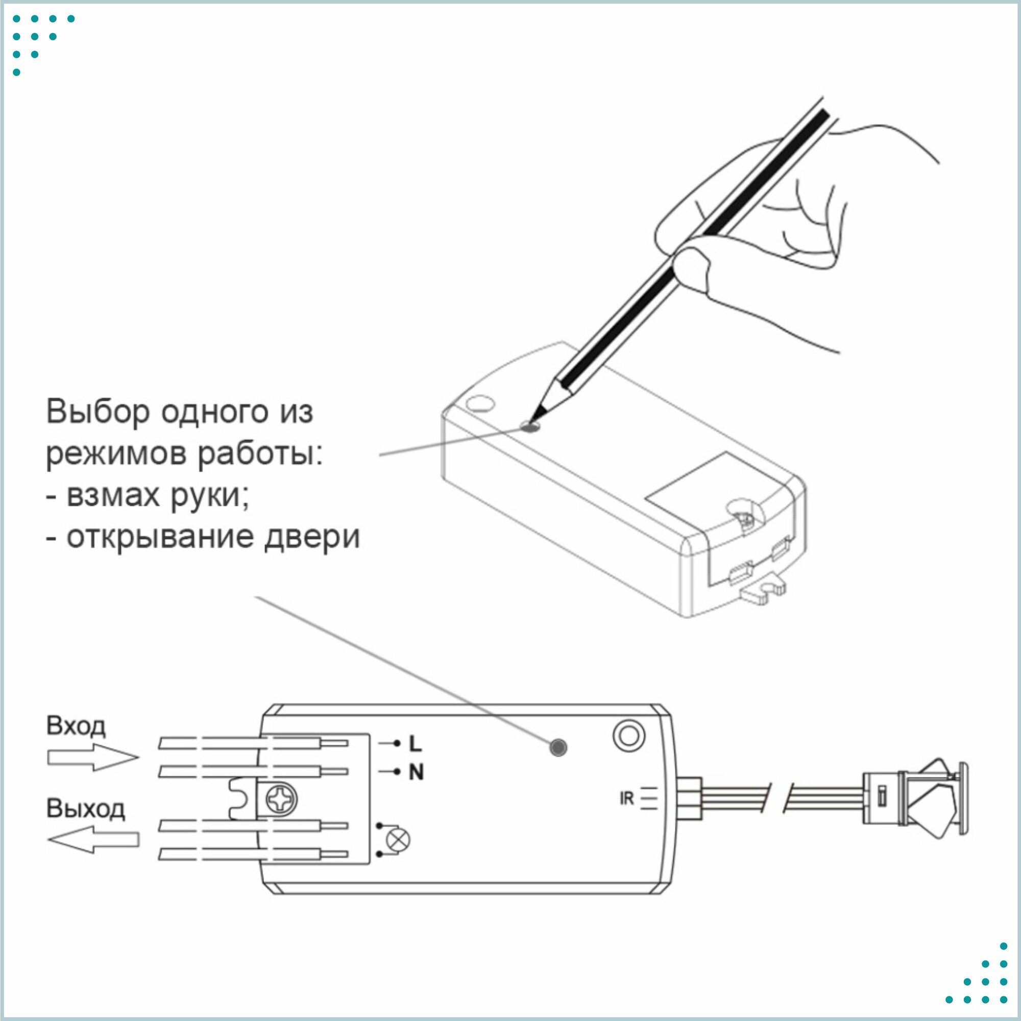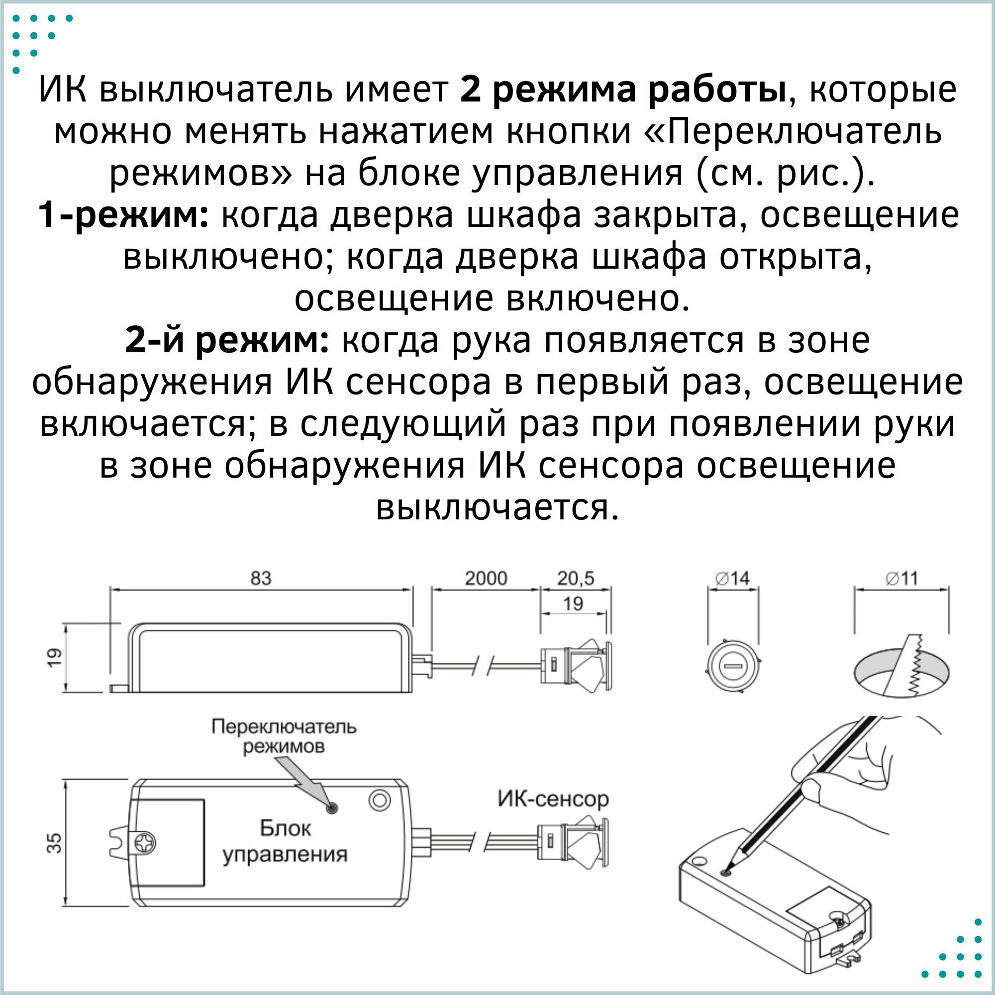 Инфракрасный сенсорный двухрежимный выключатель PM 218DR, это универсальная модель выключателя, совмещающая в себе функции выключателя срабатывающего на движение руки мимо активного элемента и на наличие преграды, как вариант, дверца в шкафу.