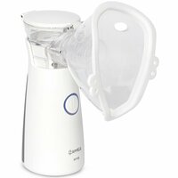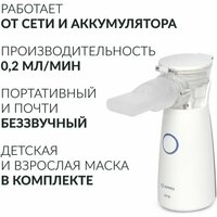 Небулайзер поставляется с детской и взрослой масками с силиконовыми держателями, а также мундштуком. Кроме того, в комплект входит USB-кабель для зарядки аккумулятора и работы от сети. Прибор вместе со всеми принадлежностями помещается в удобную сумку для хранения.