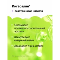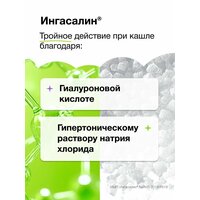 | Фармакологическое действие | Раствор Ингасалин предназначен для ускорения отхождения вязкого секрета (мокроты) в дыхательных путях благодаря осмотическому механизму. Высокая концентрация соли притягивает воду и способствует регидратации бронхиальной слизи.Гиалуроновая кислота (натрия гиалуронат) - компонент в составе средства Ингасалин, обладает способностью связывать большое количество молекул воды и удерживать их в межфибриллярном пространстве, участвует в защитных механизмах, стимулируя движения ресничек, защищает ткань легких от пагубного воздействия ферментов.Благодаря наличию гиалуроновой кислоты в составе средства Ингасалин значительно улучшается переносимость и приверженность пациентов к терапии.Ингасалин особенно показан пациентам с муковисцидозом и бронхоэктазами.Медицинское изделие Ингасалин предназначено для самостоятельного применения в домашних условиях, а также для использования в лечебно-профилактических учреждениях. |