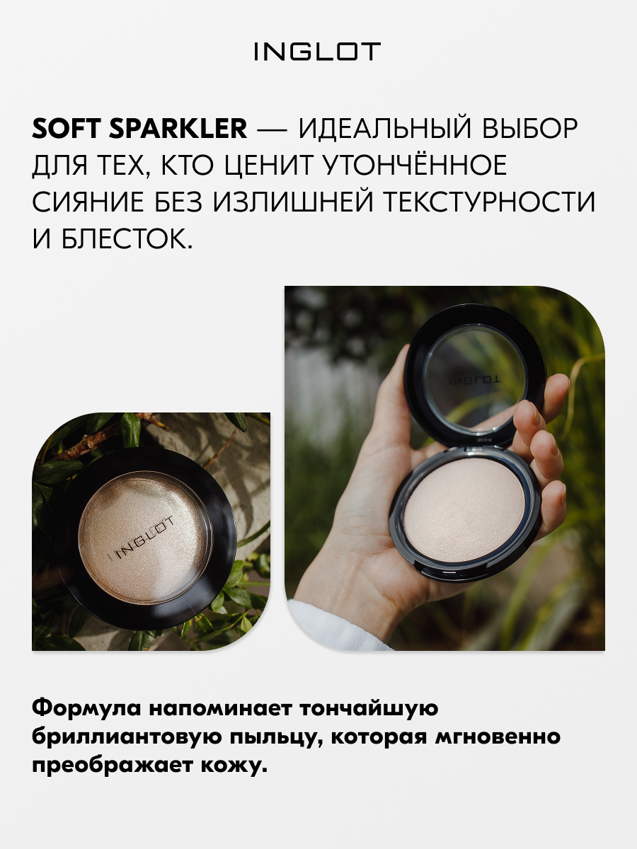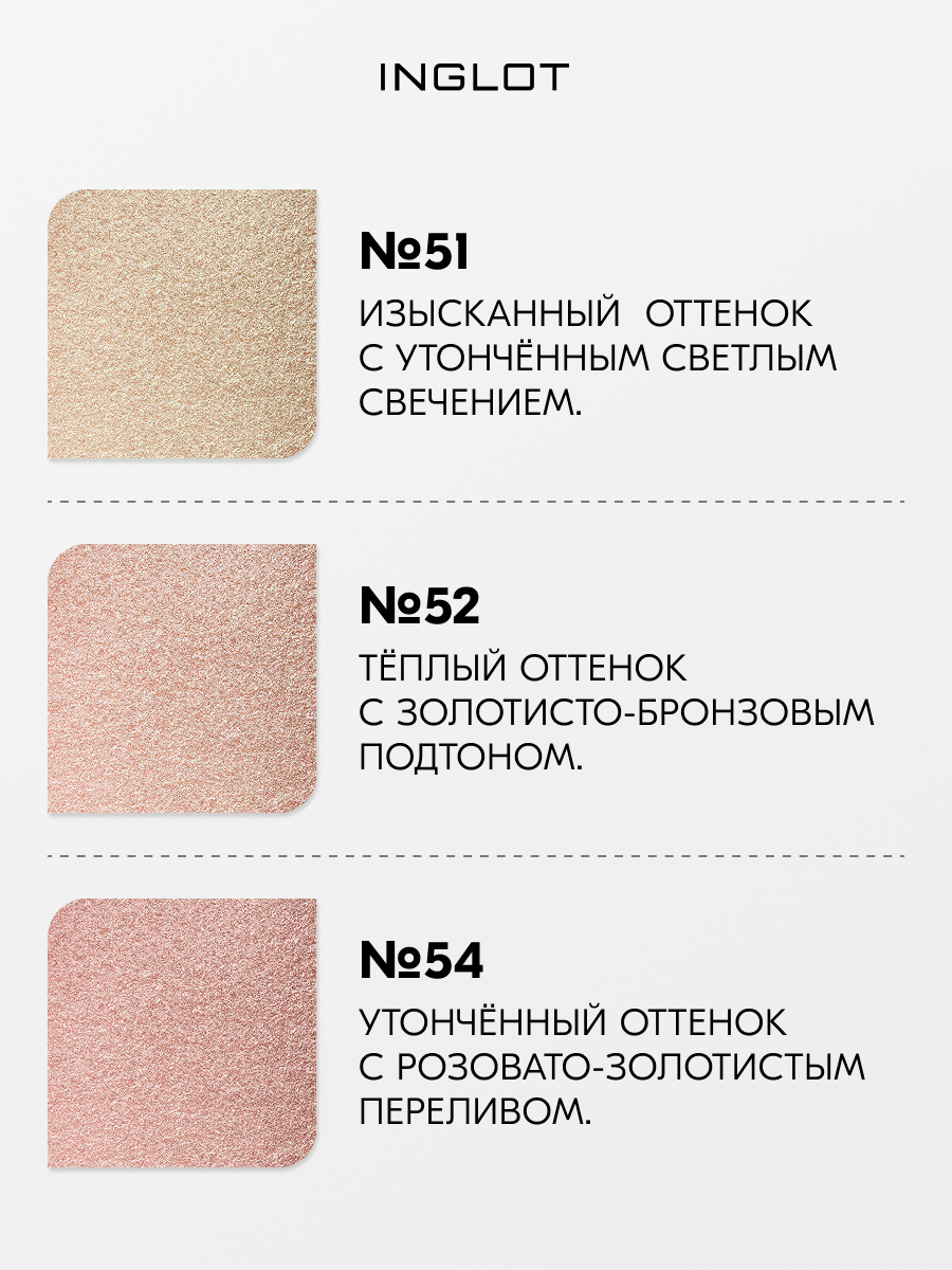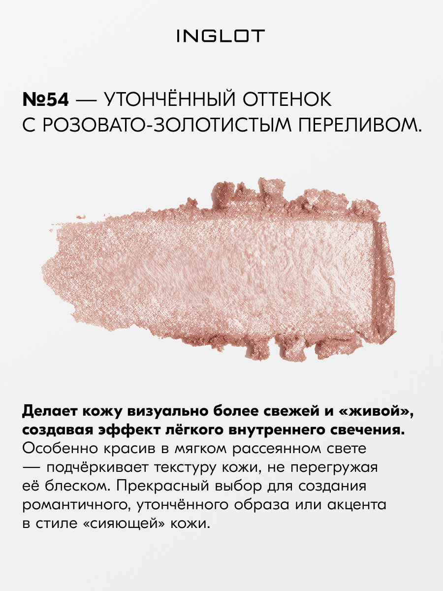 Хайлайтер Highlighter soft sparkler FEB 54 - многофункциональный продукт в линейке косметических средств для лица INGLOT. Средство можно использовать не только как хайлайтер, но и как румяна и тени для глаз.