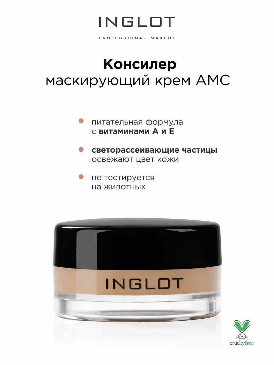 Консилер крем для лица AMC cream concealer 64 INGLOT в оттенке светлый бежевый. Маскирующий крем корректор AMC от Инглот, содержащий витамины А и Е. AMC Консилер разглаживает мелкие морщинки, придавая коже лица идеально гладкий вид, легко нейтрализует яркий пигмент вокруг глаз. Светоотражающие частицы, содержащиеся в консилере, маскируют пигментные пятна, делая кожу естественно сияющей и отдохнувшей. Крем для лица нейтрализует оттенки фиолетового под глазами, подходит даже для самых ярких синячков. Подбор оттенков: 58 – универсальный цветокорректирующий персик для всех оттенков кожи, кроме очень светлой. Нейтрализует оттенки фиолетового под глазами, подходит даже для самых ярких синячков. 62 – нейтральный беж для средних оттенков кожи. 64 – осветляющий корректор на холодном желтом подтоне. Для девушек со светлой кожей и голубым пигментом вокруг глаз. Применение: данный корректор не рекомендуется наносить на воспаленные участки (прыщики); для закрепления использовать классическую рассыпчатую пудру в цвет кожи; рекомендуется использовать с тональными основами из серии AMC и Beautifier; Продукт не содержит парабенов.