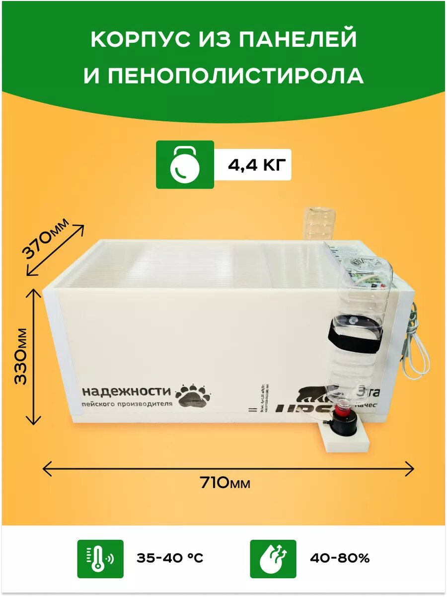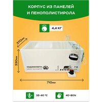 Инкубатор Матрица дели-м с алюминиевым лотком, реализуемый у нас по выгодной цене, предназначен для инкубации племенного яйца домашней птицы в подсобном хозяйстве. Представляет собой прямоугольный ящик, собранный из панелей пенополистирола. У одной из боковых стенок корпуса инкубатора закреплен блок управления. В блоке управления расположены механизмы и элементы аппарата, кроме вентиляторов и нагревателей, которые находятся в инкубационной камере. В инкубационной камере расположен решетчатый лоток для яиц с передвижной перегородкой и 2 ванночки для увлажнения воздуха. Инкубационная камера закрывается сверху крышкой из двух неравных частей. Сбоку у корпуса устанавливаются питающие стаканы и над ними лентами крепятся бутылки для долива воды в ванночки. Особенности инкубатораВ то же время в устройстве предусмотрены и некоторые доработки: * доливание воды с помощью бутылки, вместимостью 3 литра; * наличие в комплекте специального разъема и шнура для подключения к аккумулятору; * правила пользования прибором расположена на панели с управлением; * на дно ложится небольшой коврик, защищающий от грязи и мусора; * алюминиевый лоток устанавливается на поворотник любой стороной. По вместимости инкубатор блиц матрица дели на 81 яйцо идет для куриных яиц, на 24 - гусиных, на 50 – утиных, на 210 – перепелиных. Полностью автоматический, переворот, долив воды, поддержка температуры, переключение с аккумулятора и обратно. Внимание! Цвет корпуса инкубатора может отличаться от фото на карточки товара.