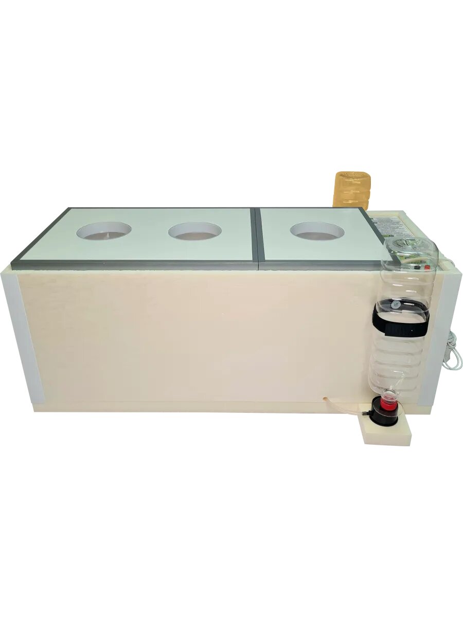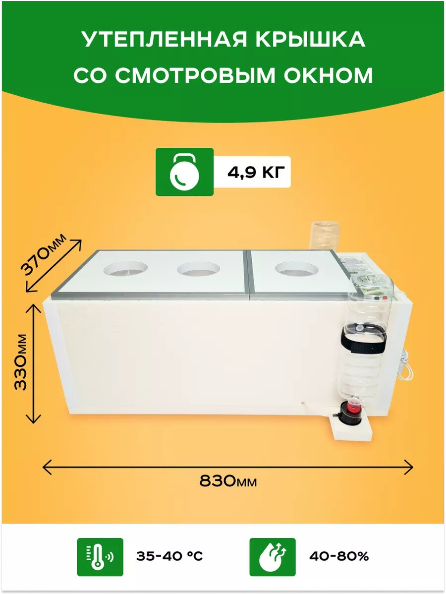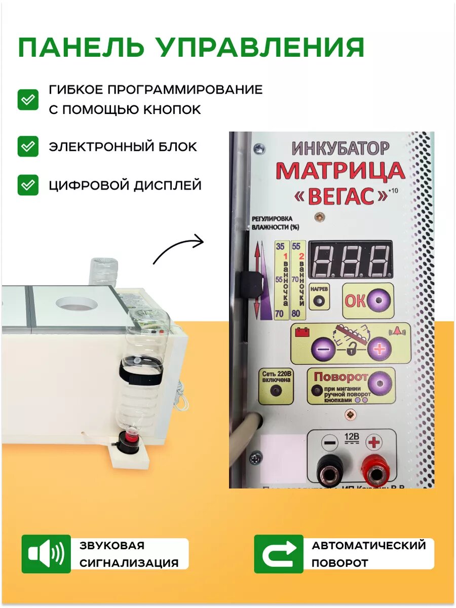 Автоматический бытовой инкубатор используют для выведения домашней птицы из свежих (не покупных) яиц. С помощью этого бюджетного устройство можно разводить в любом подсобном хозяйстве уток, кур, гусей, индеек, страусов, перепелок, голубей, цесарок. Устройство представляет собой прямоугольный ящик объемом примерно 100 литров и массой 5 кг, выполненный из листов пенополистирола (пенопласта), отличного теплоизолятора. Блок управления расположен на одной из стенок, но не в инкубационной камере. Вентиляторы, нагреватели, алюминиевый решетчатый лоток, передвижную перегородку, 2 увлажняющие ванночки устанавливают внутри инкубационной камеры. По бокам, снаружи, установлены питающие стаканы под обычные пластиковые бутылки с водой (для увлажнения). Вместимость: * 102 куриных яйца * 32 гусиных яиц * 60 утиных яиц * 258 перепелиных Усовершенствования: * Система автодолива воды на 3 литра * Новый разъем для подсоединения аккумулятора и шнур для подключения в комплекте * Краткая инструкция прямо на панели управления * Коврик для защиты от мусора и грязи на дне инкубатора * Алюминиевый лоток можно поворачивать и ставить любой стороной к поворотному механизму. Температура, время поворота, влажность, вентиляция уже настроены. ПреимуществаИспользование инкубаторов Блиц, Матрица Вегас имеет следующую выгоду и преимущества: * Предусмотрено резервное питание от аккумуляторов 12 В. Переход на 12 В при отключении электричества происходит автоматически. * Точность измерения и поддержание температуры - 0,1 градус. * Предусмотрена регулировка влажности. * Поворот яиц происходит автоматически. * Есть смотровые окошки. * Есть встроенный термометр. * Установлен принудительный воздухообмен! Внимание! Цвет корпуса инкубатора может отличаться от фото на карточки товара!