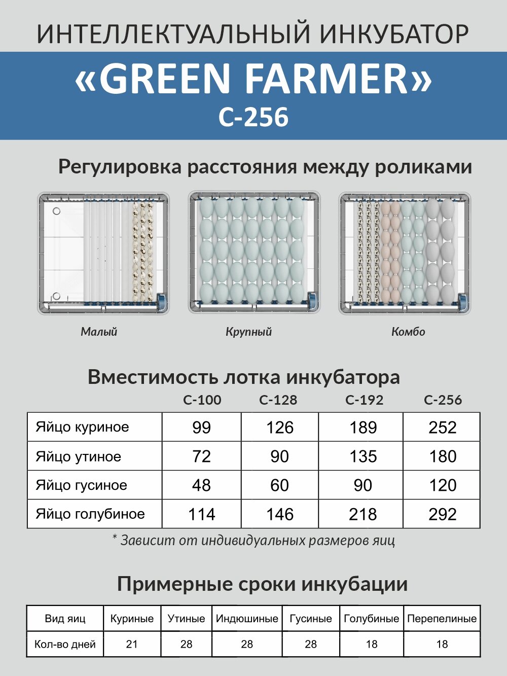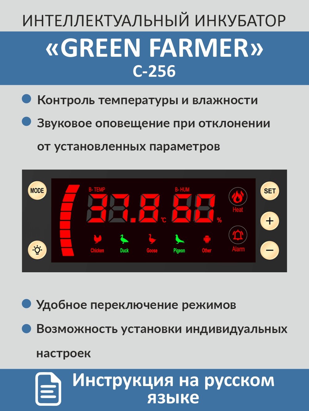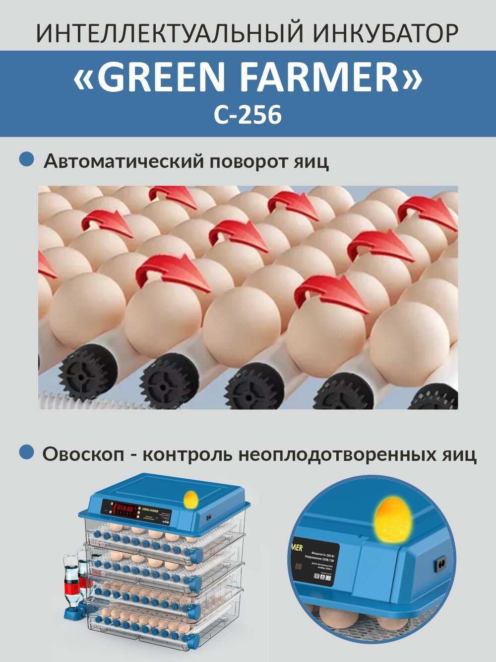 Автоматический интеллектуальный инкубатор для яиц GREEN FARMER С-256 – это отличное решение для тех, кто хочет заниматься разведением птиц, будь то начинающий любитель или опытный фермер. С его помощью можно эффективно инкубировать различные виды яиц, включая куриные, перепелиные, утиные, индушиные и гусиные. Основные характеристики: Автоматизация: Инкубатор автоматически поддерживает оптимальные параметры температуры и влажности, что значительно упрощает процесс. Вместимость: Он позволяет одновременно инкубировать 252 куриных, 180 утиных или индюшиных и 120 гусиных яиц, что удобно для небольших хозяйств. Качество материалов: Изготовлен из прочного пластика, устойчивого к повреждениям, что обеспечивает долговечность конструкции. Точный терморегулятор: Обеспечивает стабильное поддержание температуры, предотвращая риск перегрева или переохлаждения. Овоскоп: Контроль неоплодотворённых и испорченных яиц. Защита от перегрева: Системы безопасности предотвращают возможные повреждения, обеспечивая надежность инкубационного процесса. Автоматический переворот: Интеллектуальная система инкубатора автоматически переворачивает яйца, что способствует оптимальному развитию эмбрионов. Утепление: Дополнительное утепление с помощью пенопласта способствует поддержанию стабильного микроклимата внутри инкубатора, минимизируя влияние резких температурных колебаний. Настройка параметров: Предлагает возможности регулирования температуры и времени переворота для точного контроля. Удобный интерфейс: Простота управления делает устройство доступным даже для новичков. Инкубатор обладает характеристиками, которые делают его похожим на инкубаторы таких брендов, как Ряба, Золушка, Блиц, Матрица, Фермер, Несушка и другие. Инкубатор – это не только полезное устройство для разведения птиц, но и отличный подарок на любой праздник! Его можно подарить на день рождения, Новый год, свадьбу или даже на профессиональный праздник. Такой подарок станет оригинальным и практичным решением для любителей природы и сельского хозяйства. Инкубатор открывает новые возможности для увлекательного хобби и поможет осуществить мечту о разведении домашних животных, что, безусловно, порадует любого получателя. Инкубатор GREEN FARMER С-256 – это надежный и высокотехнологичный помощник для разведения птицы, способный обеспечить отличные условия для выведения здоровых птенцов.