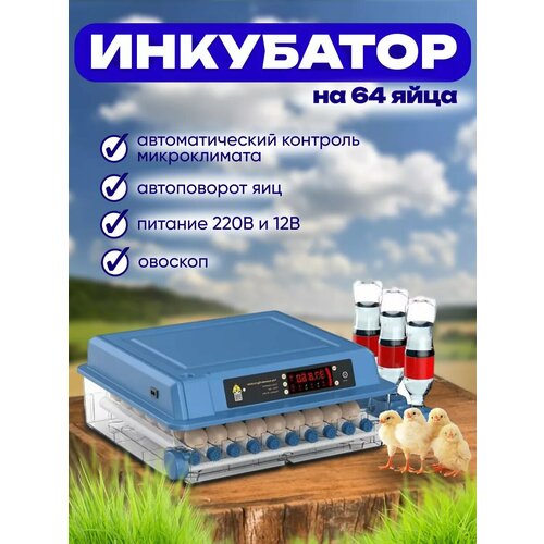 Инкубатор 64 - инкубатор для яиц автоматический на 64 куриных яйца, 42 утиных яйца , 32 гусиных яйца, 96 голубиных и 160 перепелиных яиц. Инкубатор - это бытовая техника, которая необходима в фермерстве для выведения несушек и бройлеров. Он обеспечивает норму температуры, влажности и вентиляции для яиц, позволяя им развиваться и вылупляться в течение определенного времени.