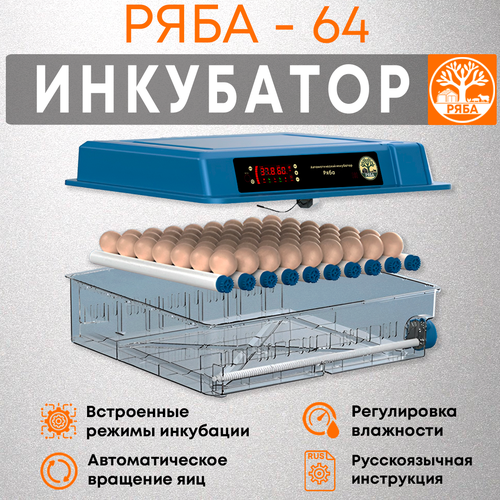 Ряба - 64 - инкубатор для яиц автоматический на 64 куриных яйца, 42 утиных яйца , 32 гусиных яйца, 96 голубиных и 108 перепелиных яиц. Инкубатор - это бытовая техника, которая необходима в фермерство для выведения несушек и бройлеров. Он обеспечивает норму температуры, влажности и вентиляции для яиц, позволяя им развиваться и вылупляться в течение определенного времени. Данный инкубатор является автоматическим и оснащен терморегулятором, таймером, гигрометром, вентилятором, овоскопом, сигнализацией, увлажнителем, автодоливом и автоповоротом яиц, который осуществляется каждые 2 часа. Инкубатор предназначен для инкубации яиц кур, перепелов, гусей, уток, голубей и даже рептилий и других животных, т.к. помимо автоматических программ имеет пользовательский режим и вы можете выставить любую, необходимую вам температуру и влажность. Инкубатор для яиц автоматический переворот имеет удобное управление и сеть защиты, возможна работа с аккумулятором. Прибор является электронным и имеет цифровой дисплей с индикатором температуры, влажности, времени и сигнализацией. Инкубатор имеет решетку для всех типов яиц и пластиковое окно для наблюдения. Инкубатор работает от электрической сети 220В и от аккумулятора 12В (провода в комплекте). Инкубаторы также могут использоваться для выращивания цыплят и бройлеров. Они компактны, удобны и легки в использовании. Также инкубаторы могут быть отличным подарком для женщин и мужчин, мам и пап, бабушек и дедушек, занимающихся садоводством или животноводством. Данный инкубатор является универсальным и подходит для использования как в домашних условиях, так и на фермах и в селхозмире. Он обеспечивает высокую норму выращивания и вывода птицы и других животных и является аналогом таких брендов как Несушка, Золушка, Блиц, Урал, Умница, Норма, Матрица, Sititek, Дели, Вегас, Лупер, 36, 77, 104, 63, 64, 100, 48, 28