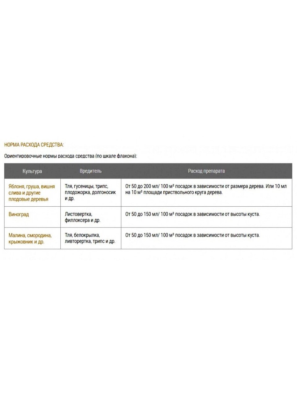 Средство для уничтожения насекомых-вредителей на всех плодовых деревьях (яблоня, груша, вишня, слива, алыча и др.) и ягодных кустарниках (виноград, смородина, крыжовник и др.) Можно использовать: от тли, гусениц, белокрылки, трипса, яблонной плодожорки. А также эффективно против таких насекомых - вредителей садовых растений, как: листовертка, жуки (в том числе колорадский), все виды мух, крестоцветные блошки, листовые пилильщики, долгоносики, цветоед, паутинный клещ.