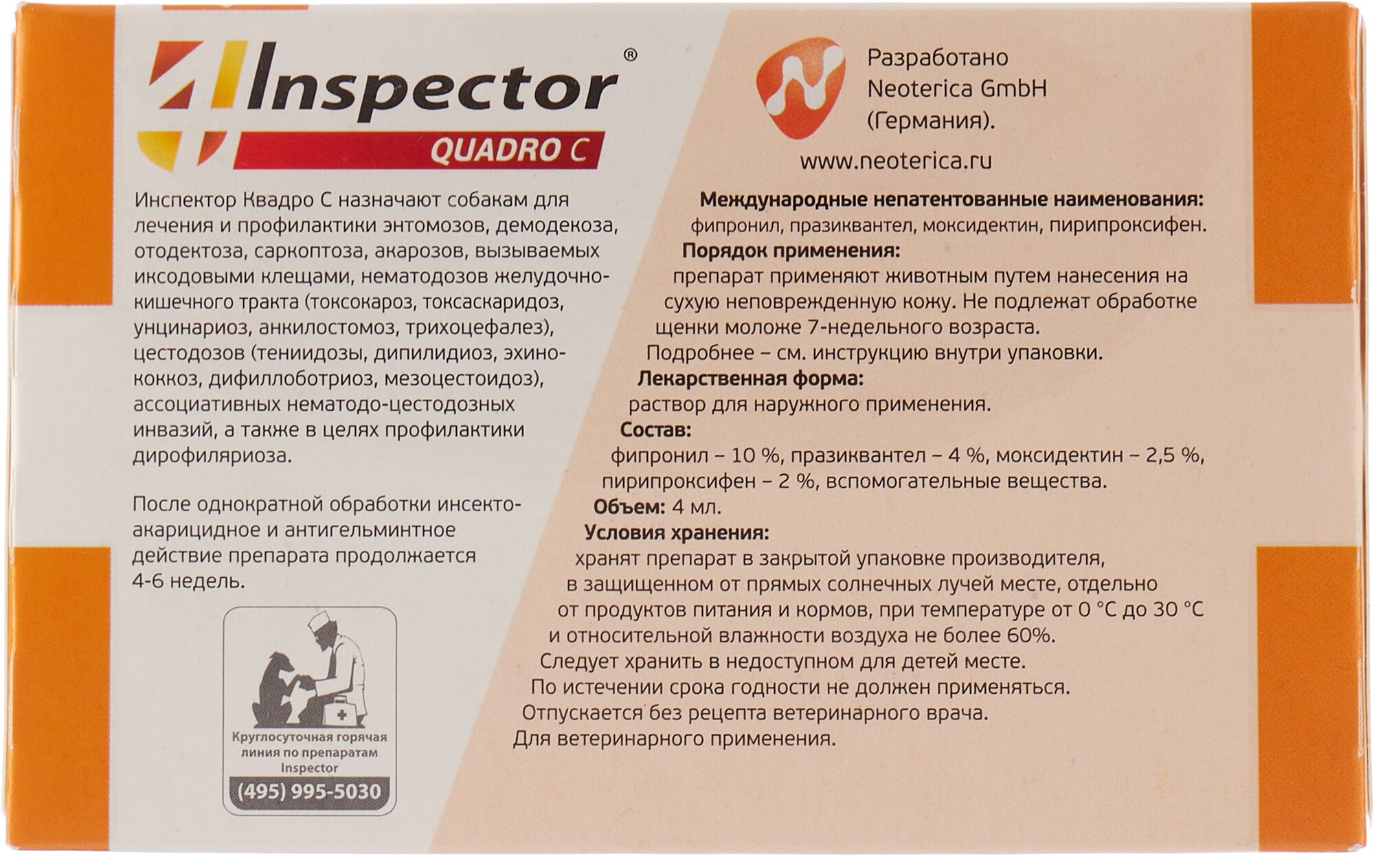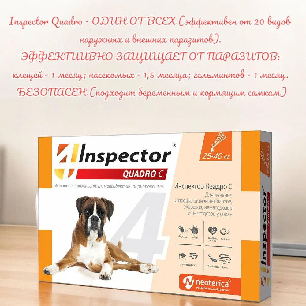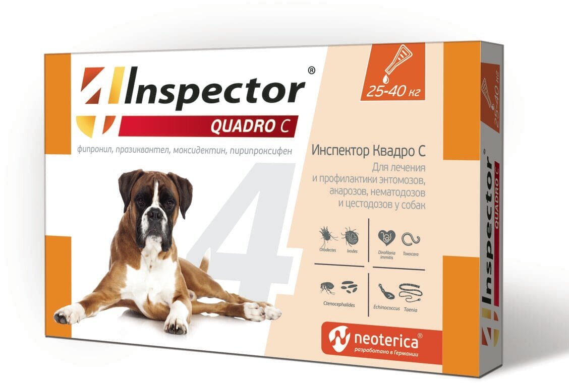 Инспектор Квадро С для собак 25-40 кг, капли на холку (от клещей, гельминтов), № 1 (комплект из 3 пачек): сравнение цен, характеристики, фото, актуальное наличие и цены.