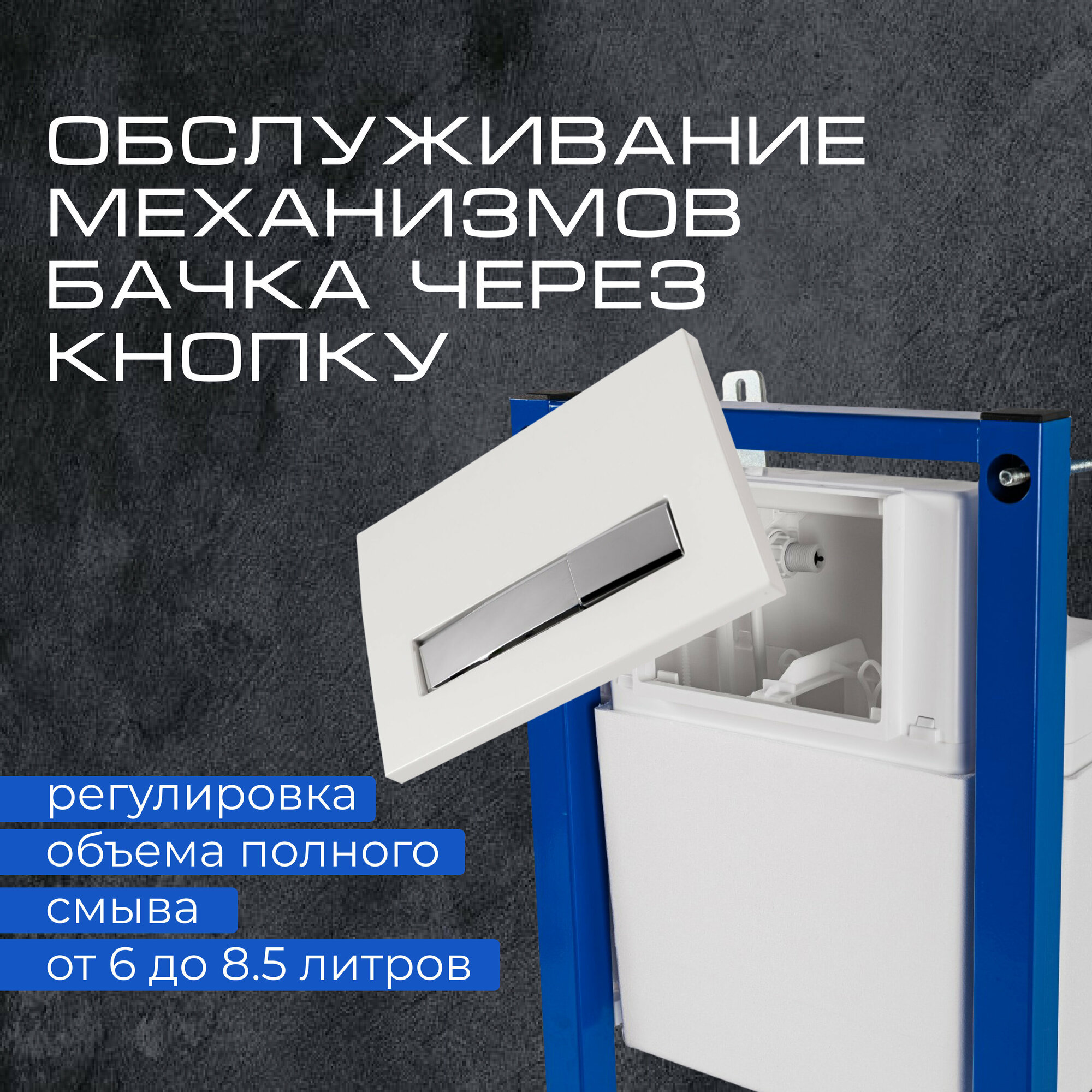2. Первая система инсталляции, полностью изготовлена в России. применение стандартных присоединительных размеров: подводка G1/2; выход в канализацию Ø110 мм; простота и удобство обслуживания; жесткая неразборная рама ( испытана под весом 400 кг.); подключение подводки воды осуществляется внутри бачка, а не снаружи, что обеспечивает возможность замены гибкого подводящего шланга без демонтажа; конкурентная цена; 3. Полный комплект, все для быстрой и удобной установки. шумоизоляция; кнопка смыва; арматура сливная; комплект крепежей и хомутов; макет для установки; защита бачка; 4. Служба поддержки. Все проблемы решаемы, просто обратись.