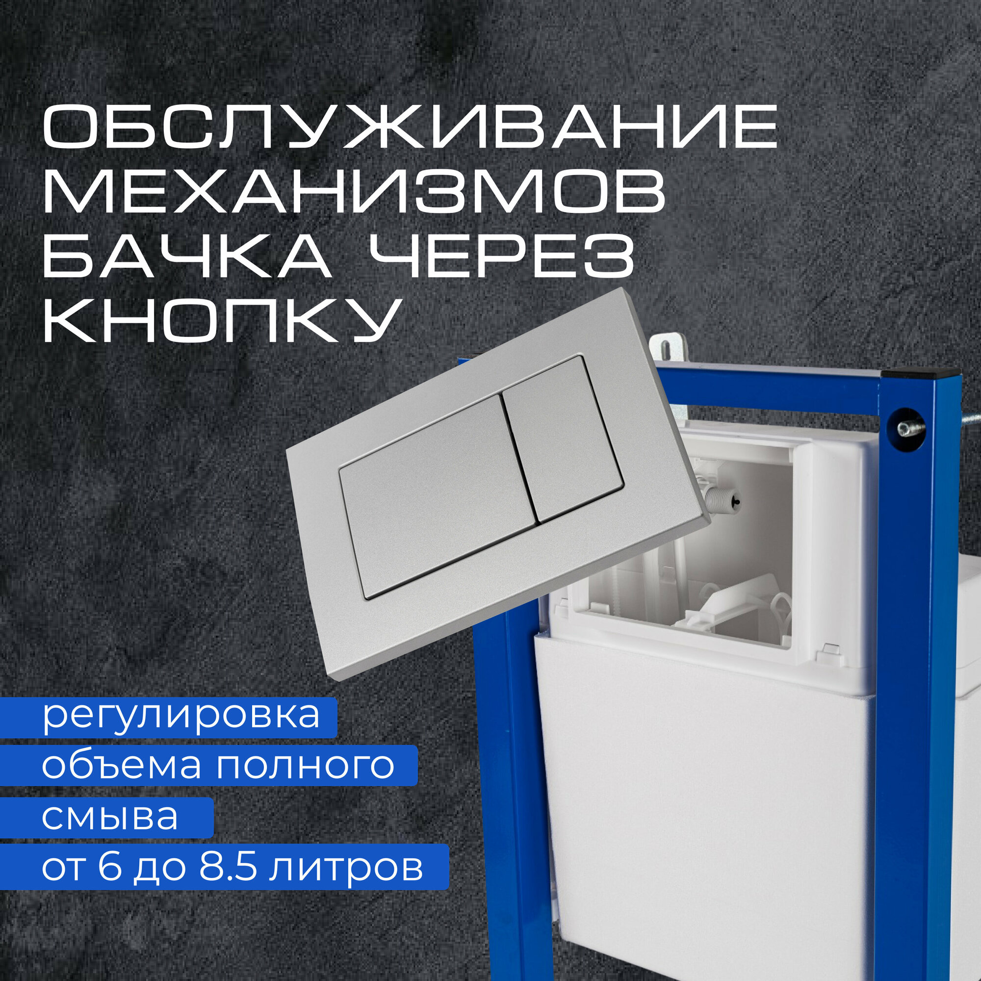 2. Первая система инсталляции, полностью изготовлена в России. применение стандартных присоединительных размеров: подводка G1/2; выход в канализацию Ø110 мм; простота и удобство обслуживания; жесткая неразборная рама ( испытана под весом 400 кг.); подключение подводки воды осуществляется внутри бачка, а не снаружи, что обеспечивает возможность замены гибкого подводящего шланга без демонтажа; конкурентная цена; 3. Полный комплект, все для быстрой и удобной установки. шумоизоляция; кнопка смыва; арматура сливная; комплект крепежей и хомутов; макет для установки; защита бачка; 4. Служба поддержки. Все проблемы решаемы, просто обратись.