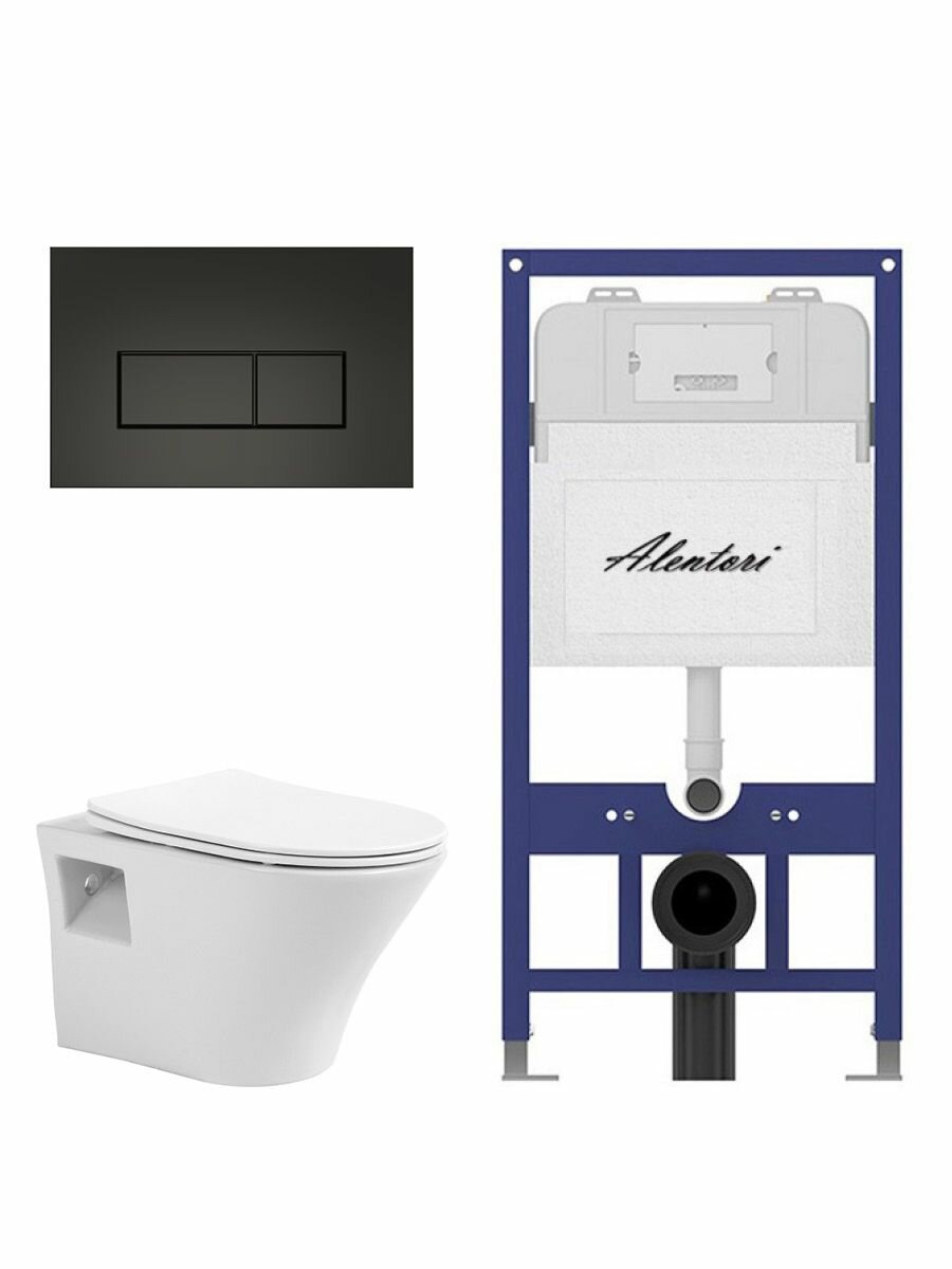 Купить Инсталляция для унитаза Alentori SISTEMA 52 AL. SIS11T с клавишей смыва CHIAVE H, черный + Подвесной безободковый унитаз AVIMANO Promotion с крышкой-сидением из дюропласта с функцией soft-close с доставкой по всей России.