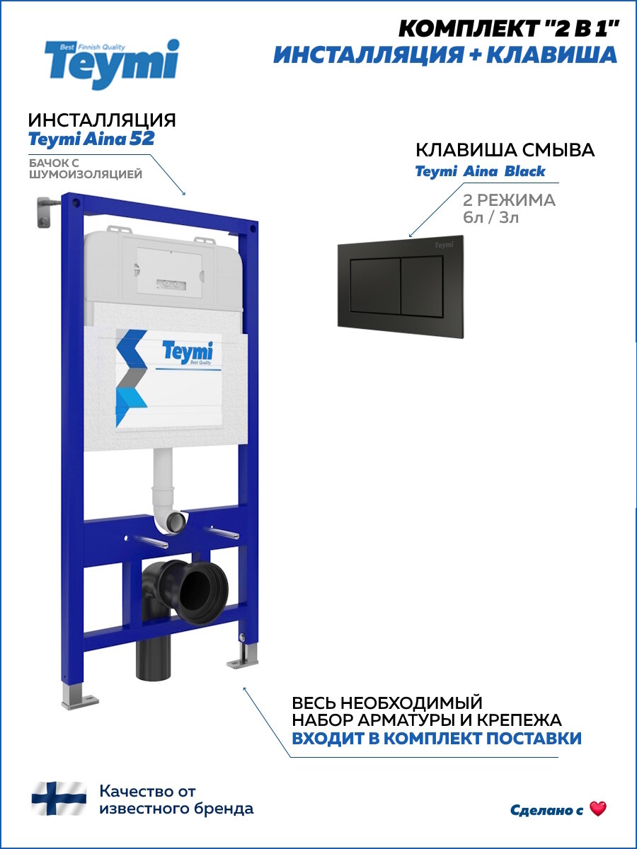 Комплект «2 в 1: инсталляция + клавиша смыва» TEYMI AINA 52 с клавишей TEYMI AINA T70013BM в цвете черный подобран специально для того, чтобы покупателям было проще сориентироваться в огромном выборе товаров для ванной комнаты. Оптимальное сочетание инсталляционной системы и клавиши смыва позволит не задумываясь сделать правильный выбор. Инсталляция для подвесного унитаза от известного финского бренда TEYMI предназначена для оборудования санузлов и выгодно отличается своей надёжностью и простотой установки.