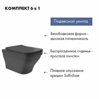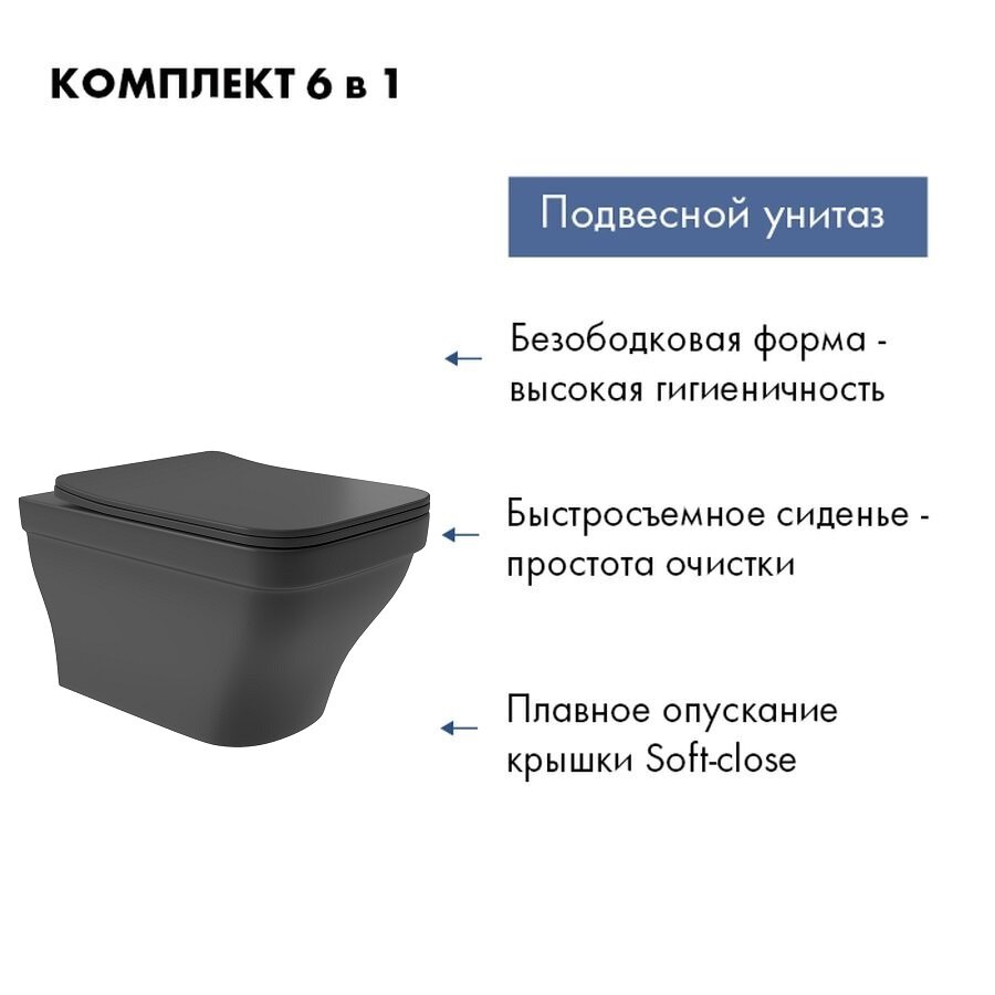 Подвесной безободковый унитаз ADT, с сиденьем микролифт, цвет черный матовый. Безободковая чаша; Быстросъемное сиденье из дюропласта с функцией плавного закрывания (микролифт); Антигрязевое покрытие; Устойчивость к царапинам;