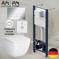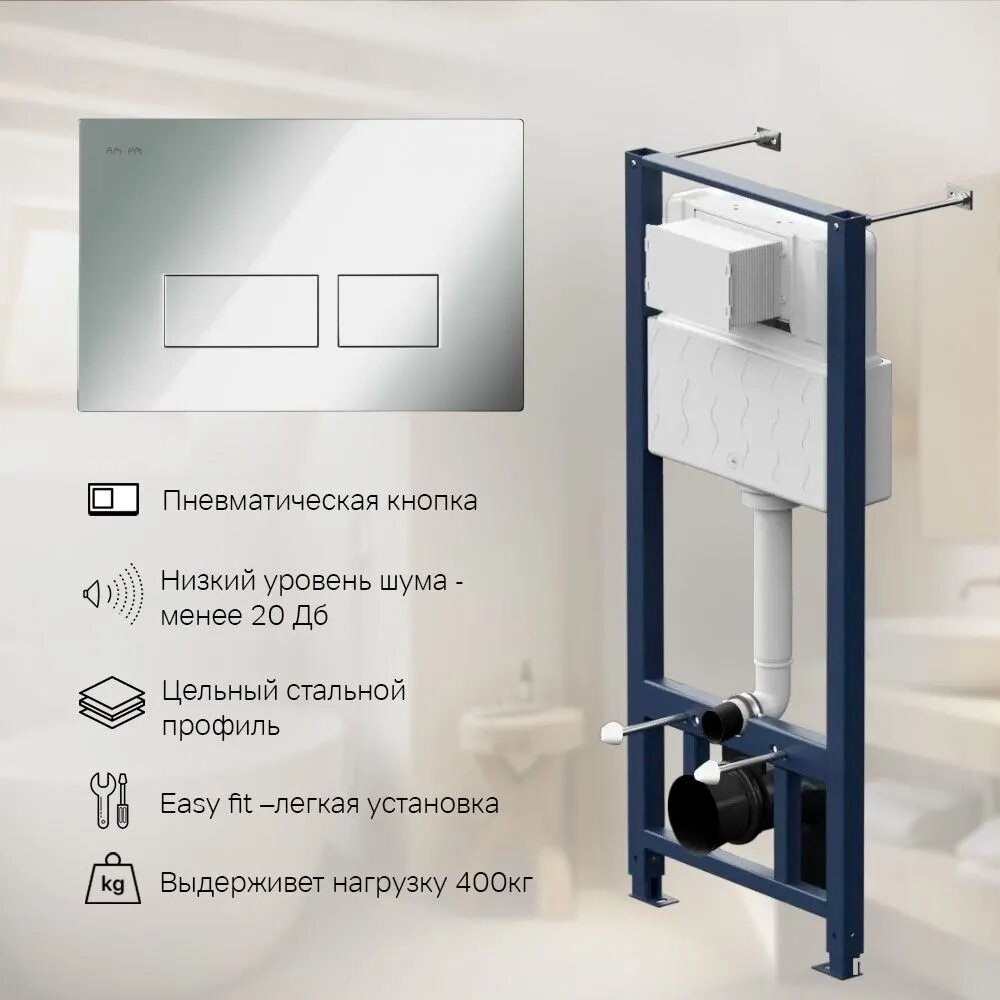 Инсталляция с подвесным унитазом AM.PM Hit FlashClean, пневматическая кнопка Jump S глянцевый хром, унитаз подвесной безободковый с инсталляцией, быстросъемное сиденье с микролифтом из дюропласта, шумоизоляция, крепления, Германия