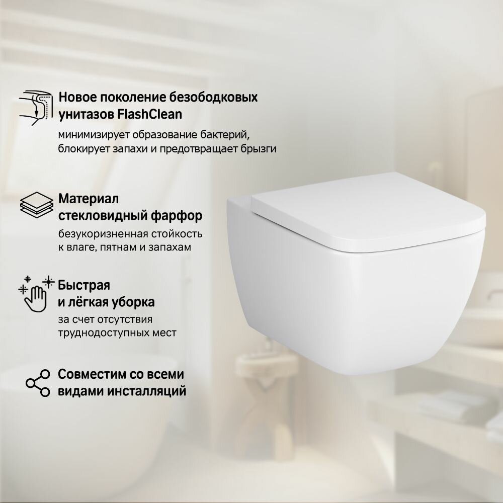 Унитаз с инсталляцией подвесной комплект с функцией FlashClean — это новое поколение безободковых унитазов без использования пластика: 100% гигиеничности, 0% брызг.