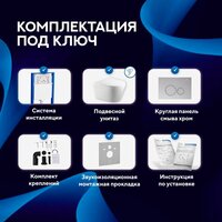 - 6 в 1 – данный комплект включает все необходимые элементы для монтажа: инсталляцию, унитаз, смывную кнопку, а также сопутствующие крепления и механизмы.
