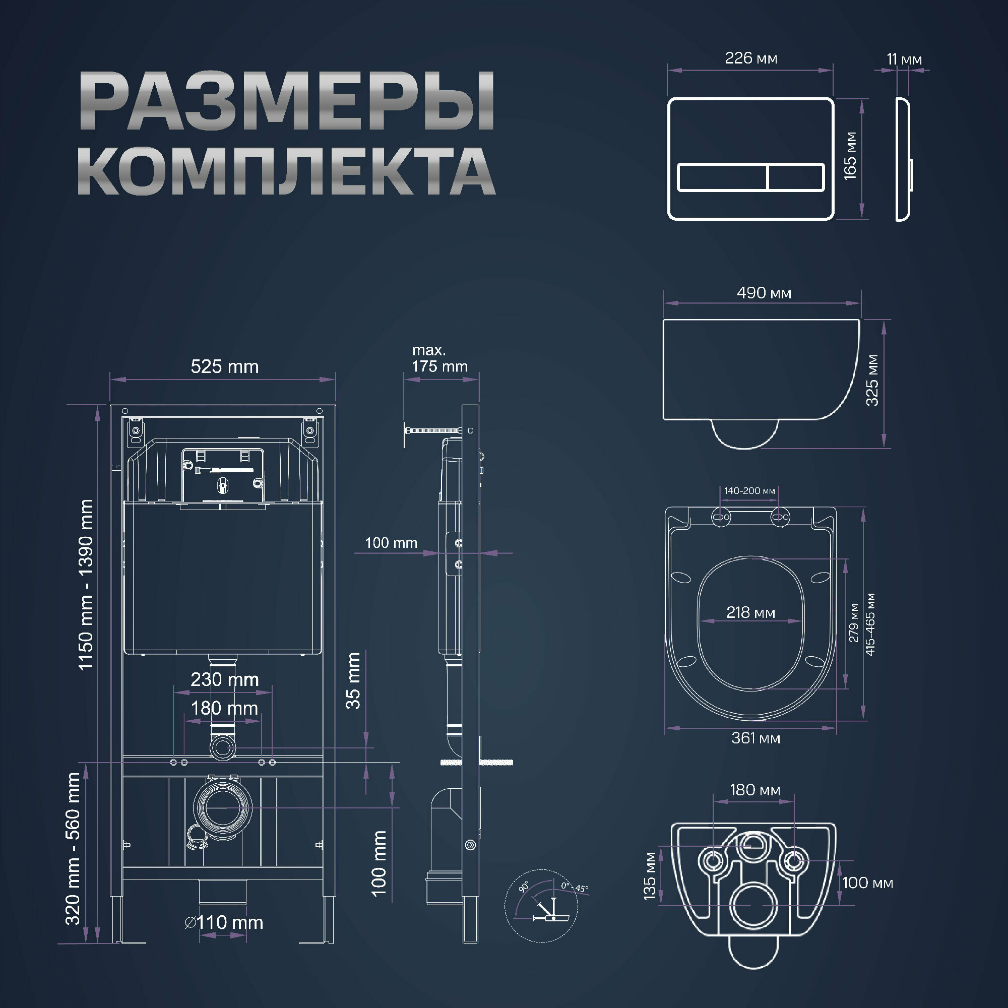 | Комплектация | бачок, инсталляция, монтажная рама, монтажный набор креплений, панель смыва, сиденье |