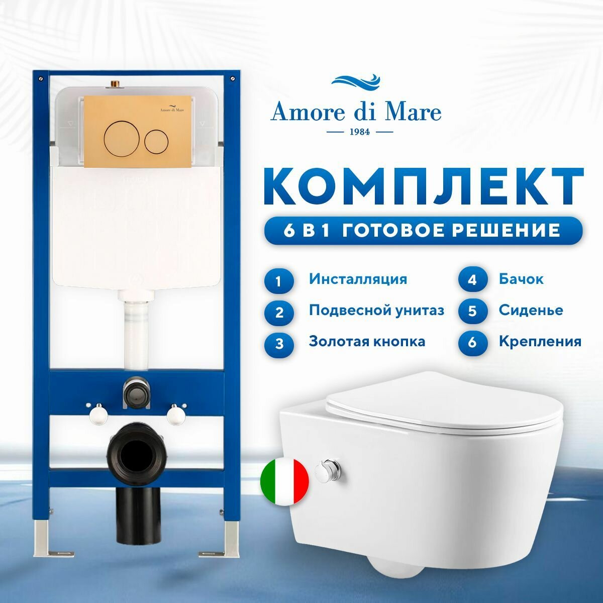 Инсталляция с подвесным унитазом с функцией биде Amore di Mare 6 в 1: инсталляция QuickFit 50114, унитаз Temo P322-X, сиденье с микролифтом, кнопка золотая 303G: сравнение цен, характеристики, фото, актуальное наличие и цены.
