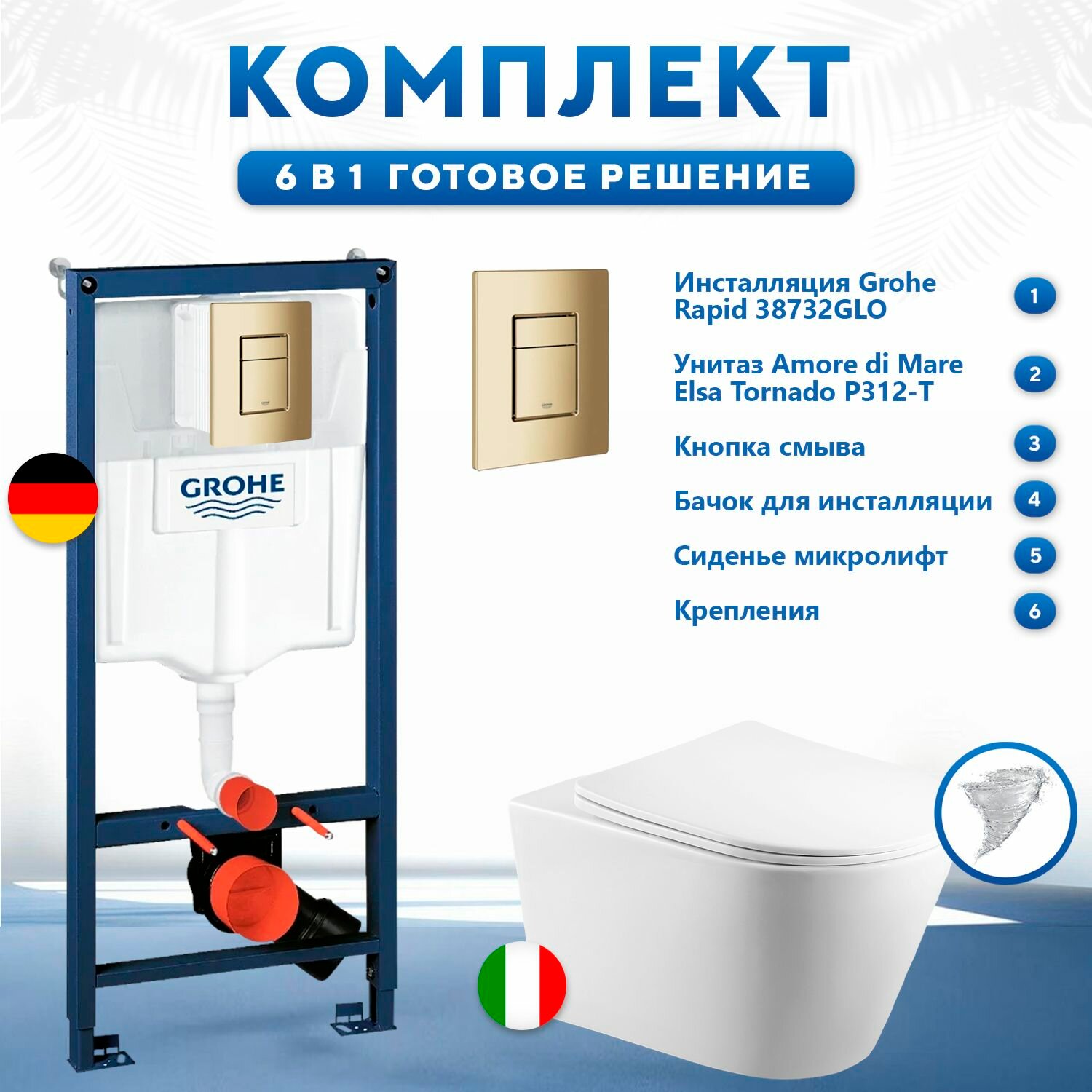 Купить Инсталляция с унитазом комплект 6 в 1: инсталляция Grohe 38732GLO + унитаз подвесной безободковый Amore di Mare Elsa P312-T + сиденье с микролифтом с доставкой по всей России.