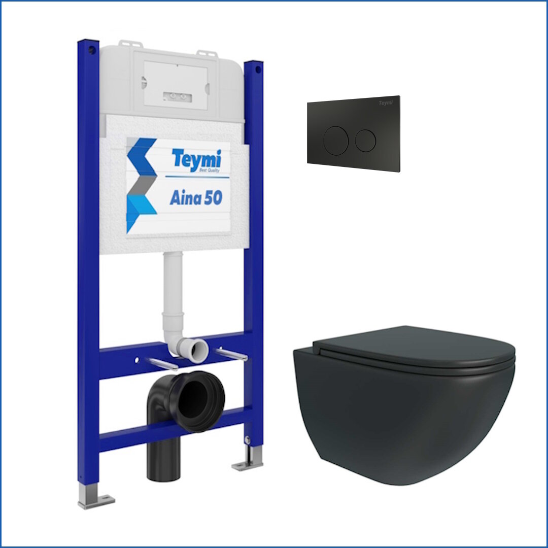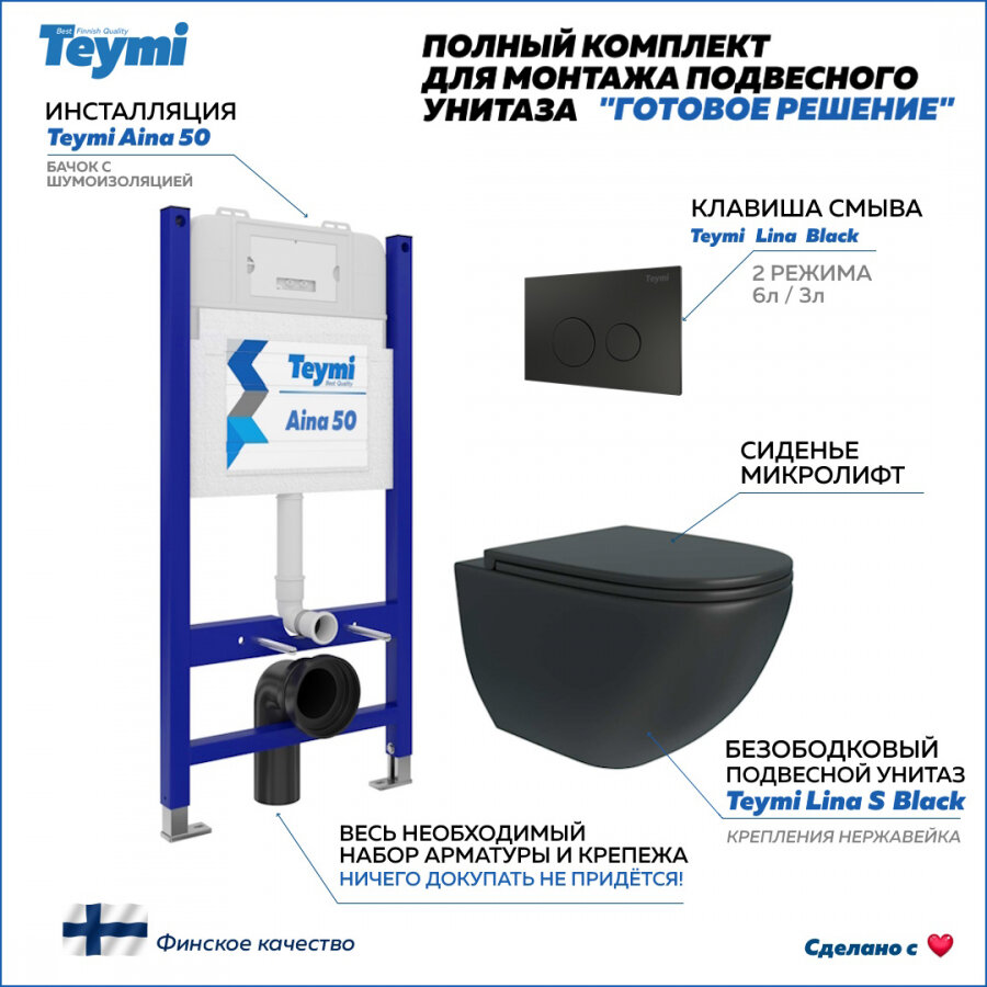 Комплект «Готовое решение» для установки инсталляции с подвесным унитазом: -- инсталляция TEYMI AINA 50 T70033 – монтажная рама из цельного стального профиля прямоугольного сечения, позволяющая выдерживать нагрузки до 400 кг. Габаритная ширина рамы 525 мм; -- цельнолитой бесшовный бачок скрытого монтажа, обшитый кожухом из пенопласта; -- клавиша смыва TEYMI LINA T70103BM, цвет черный матовый; -- унитаз подвесной безободковый TEYMI LINA S BLACK T40111; -- ультратонкое сиденье с микролифтом; -- полный комплект арматуры для монтажа: уплотнительные кольца, манжеты, труба смыва, фановый отвод с удлинителем, защитный кожух ревизионного окна с крепежной рамкой, закрывающей панелью и крышкой; -- полный комплект крепежа для установки: крепеж к стене, шпильки для унитаза, крепежная рамка, соединительные шпильки, толкатели, фиксаторы; -- инструкция по установке и обслуживанию.