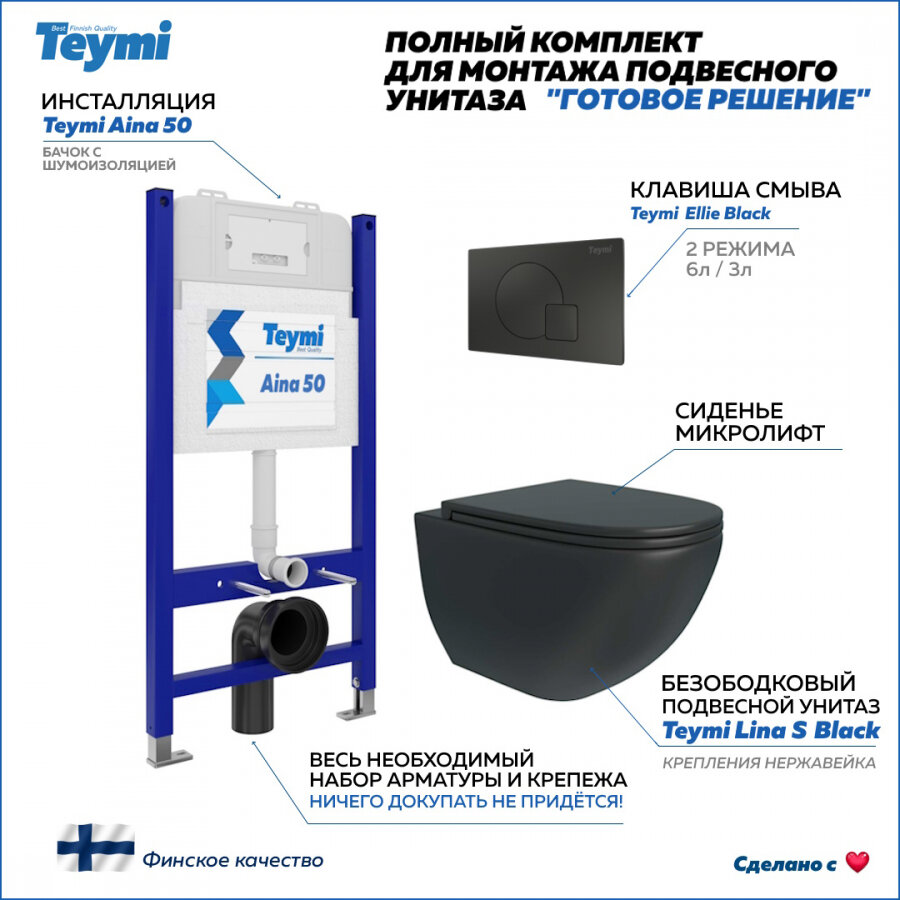 Комплект «Готовое решение» для установки инсталляции с подвесным унитазом: -- инсталляция TEYMI AINA 50 T70033 – монтажная рама из цельного стального профиля прямоугольного сечения, позволяющая выдерживать нагрузки до 400 кг. Габаритная ширина рамы 525 мм; -- цельнолитой бесшовный бачок скрытого монтажа, обшитый кожухом из пенопласта; -- клавиша смыва TEYMI ELLIE T70023BM, цвет черный матовый; -- унитаз подвесной безободковый TEYMI LINA S BLACK T40111; -- ультратонкое сиденье с микролифтом; -- полный комплект арматуры для монтажа: уплотнительные кольца, манжеты, труба смыва, фановый отвод с удлинителем, защитный кожух ревизионного окна с крепежной рамкой, закрывающей панелью и крышкой; -- полный комплект крепежа для установки: крепеж к стене, шпильки для унитаза, крепежная рамка, соединительные шпильки, толкатели, фиксаторы; -- инструкция по установке и обслуживанию.