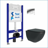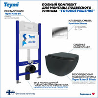 Комплект «Готовое решение» для установки инсталляции с подвесным унитазом: -- инсталляция TEYMI AINA 50 T70033 – монтажная рама из цельного стального профиля прямоугольного сечения, позволяющая выдерживать нагрузки до 400 кг. Габаритная ширина рамы 525 мм; -- цельнолитой бесшовный бачок скрытого монтажа, обшитый кожухом из пенопласта; -- клавиша смыва TEYMI HELMI T70202CH, цвет хром глянец; -- унитаз подвесной безободковый TEYMI LINA S BLACK T40111; -- ультратонкое сиденье с микролифтом; -- полный комплект арматуры для монтажа: уплотнительные кольца, манжеты, труба смыва, фановый отвод с удлинителем, защитный кожух ревизионного окна с крепежной рамкой, закрывающей панелью и крышкой; -- полный комплект крепежа для установки: крепеж к стене, шпильки для унитаза, крепежная рамка, соединительные шпильки, толкатели, фиксаторы; -- инструкция по установке и обслуживанию.