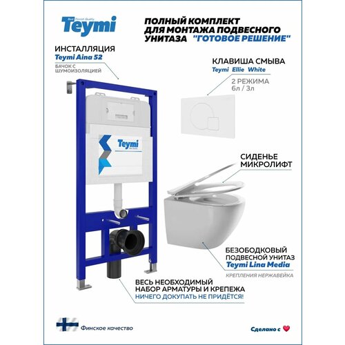 Комплект «Готовое решение» для установки инсталляции TEYMI AINA 52 с подвесным унитазом TEYMI LINA MEDIA T40105 и клавишей TEYMI ELLIE T70024WM в цвете белый матовый подобран специально для того, чтобы покупателям было проще сориентироваться в огромном выборе товаров для ванной комнаты. Оптимальное сочетание инсталляционной системы, клавиши смыва и подвесного унитаза позволит не задумываясь сделать правильный выбор. Инсталляция для подвесного унитаза от известного финского бренда TEYMI предназначена для оборудования санузлов и выгодно отличается своей надёжностью и простотой установки.
