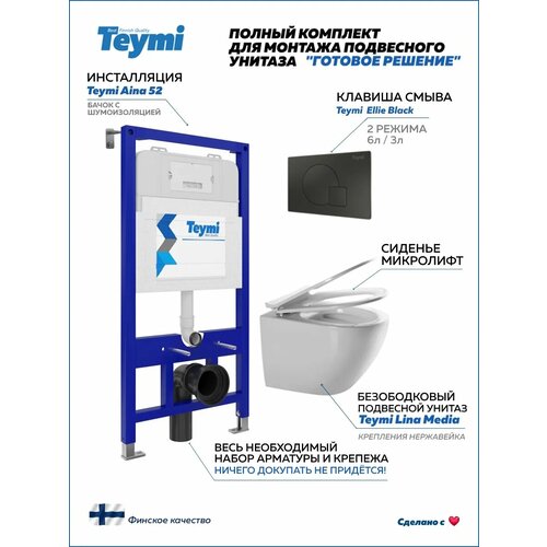 Комплект «Готовое решение» для установки инсталляции TEYMI AINA 52 с подвесным унитазом TEYMI LINA MEDIA T40105 и клавишей TEYMI ELLIE T70023BM в цвете черный матовый подобран специально для того, чтобы покупателям было проще сориентироваться в огромном выборе товаров для ванной комнаты. Оптимальное сочетание инсталляционной системы, клавиши смыва и подвесного унитаза позволит не задумываясь сделать правильный выбор. Инсталляция для подвесного унитаза от известного финского бренда TEYMI предназначена для оборудования санузлов и выгодно отличается своей надёжностью и простотой установки.