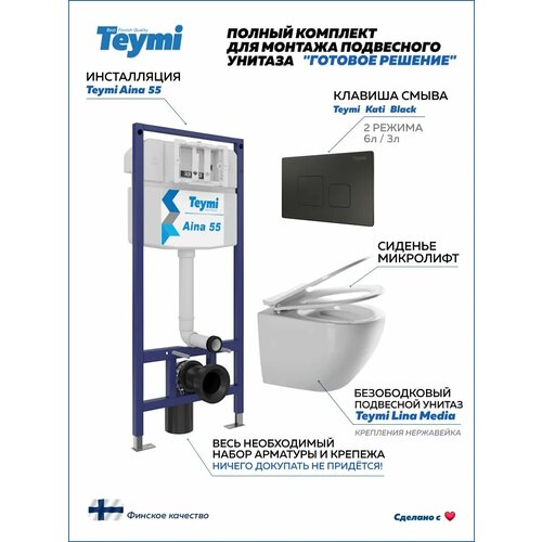 Комплект «Готовое решение» для установки инсталляции с подвесным унитазом: -- инсталляция TEYMI AINA 55 T70035 – монтажная рама из цельного стального профиля прямоугольного сечения, позволяющая выдерживать нагрузки до 400 кг. Габаритная ширина рамы 470 мм; -- цельнолитой бесшовный бачок скрытого монтажа; -- клавиша смыва TEYMI KATI T70702BM, цвет черный матовый; -- унитаз подвесной безободковый TEYMI LINA MEDIA T40105; -- сиденье с микролифтом; -- полный комплект арматуры для монтажа: уплотнительные кольца, манжеты, труба смыва, фановый отвод с удлинителем, защитный кожух ревизионного окна с крепежной рамкой, закрывающей панелью и крышкой; -- полный комплект крепежа для установки: крепеж к стене, шпильки для унитаза, крепежная рамка, соединительные шпильки, толкатели, фиксаторы; -- инструкция по установке и обслуживанию.
