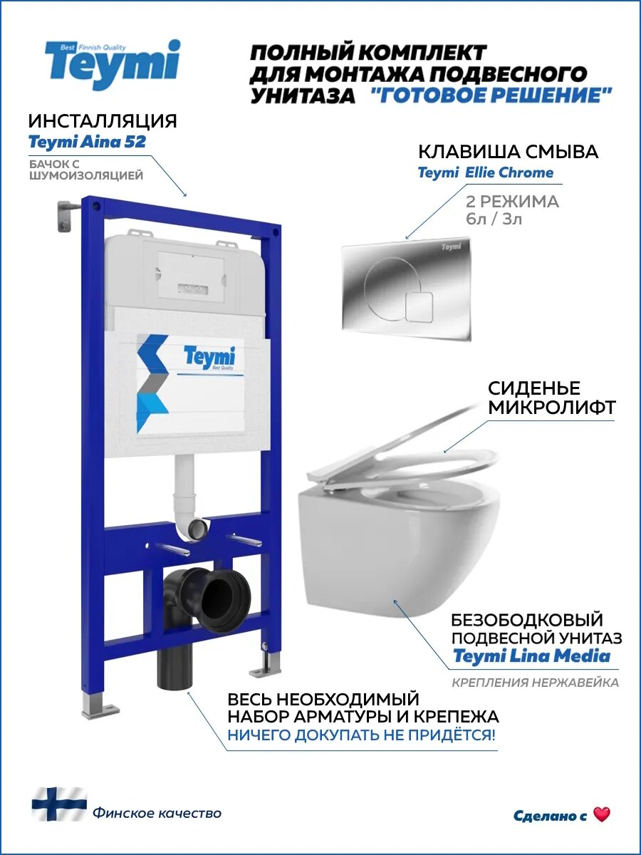 Комплект «Готовое решение» для установки инсталляции TEYMI AINA 52 с подвесным унитазом TEYMI LINA MEDIA T40105 и клавишей TEYMI ELLIE T70022CH в цвете хром подобран специально для того, чтобы покупателям было проще сориентироваться в огромном выборе товаров для ванной комнаты. Оптимальное сочетание инсталляционной системы, клавиши смыва и подвесного унитаза позволит не задумываясь сделать правильный выбор. Инсталляция для подвесного унитаза от известного финского бренда TEYMI предназначена для оборудования санузлов и выгодно отличается своей надёжностью и простотой установки.
