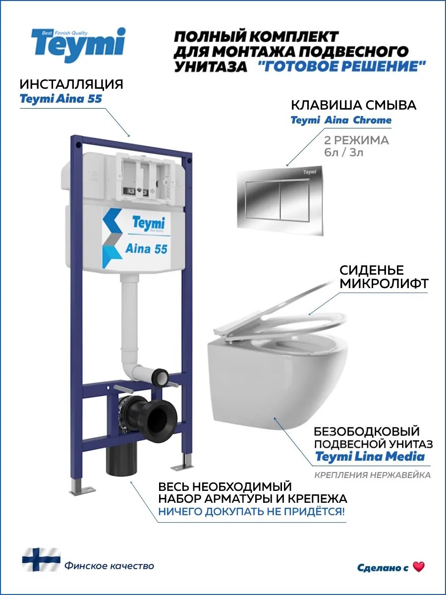 Купить Инсталляция с унитазом комплект 5 в 1 Teymi унитаз подвесной безободковый Lina Media кнопка хром F13668 с доставкой по всей России.